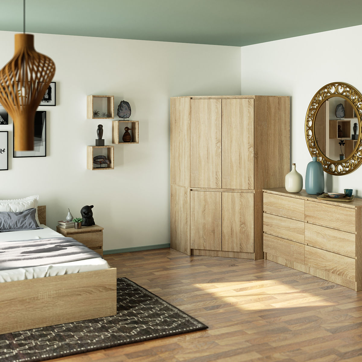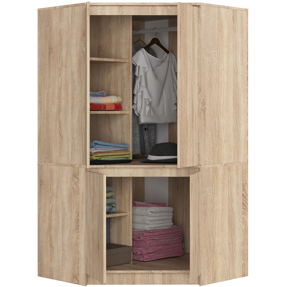 Der vierflügelige Kleiderschrank ist aus strapazierfähiger laminierter Platte gefertigt. Der Korpus des Möbels ist komplett in der Farbe Eiche Sonoma gehalten. Ausgestattet mit einer Stange und 6 Regalen, bietet er viel Stauraum.