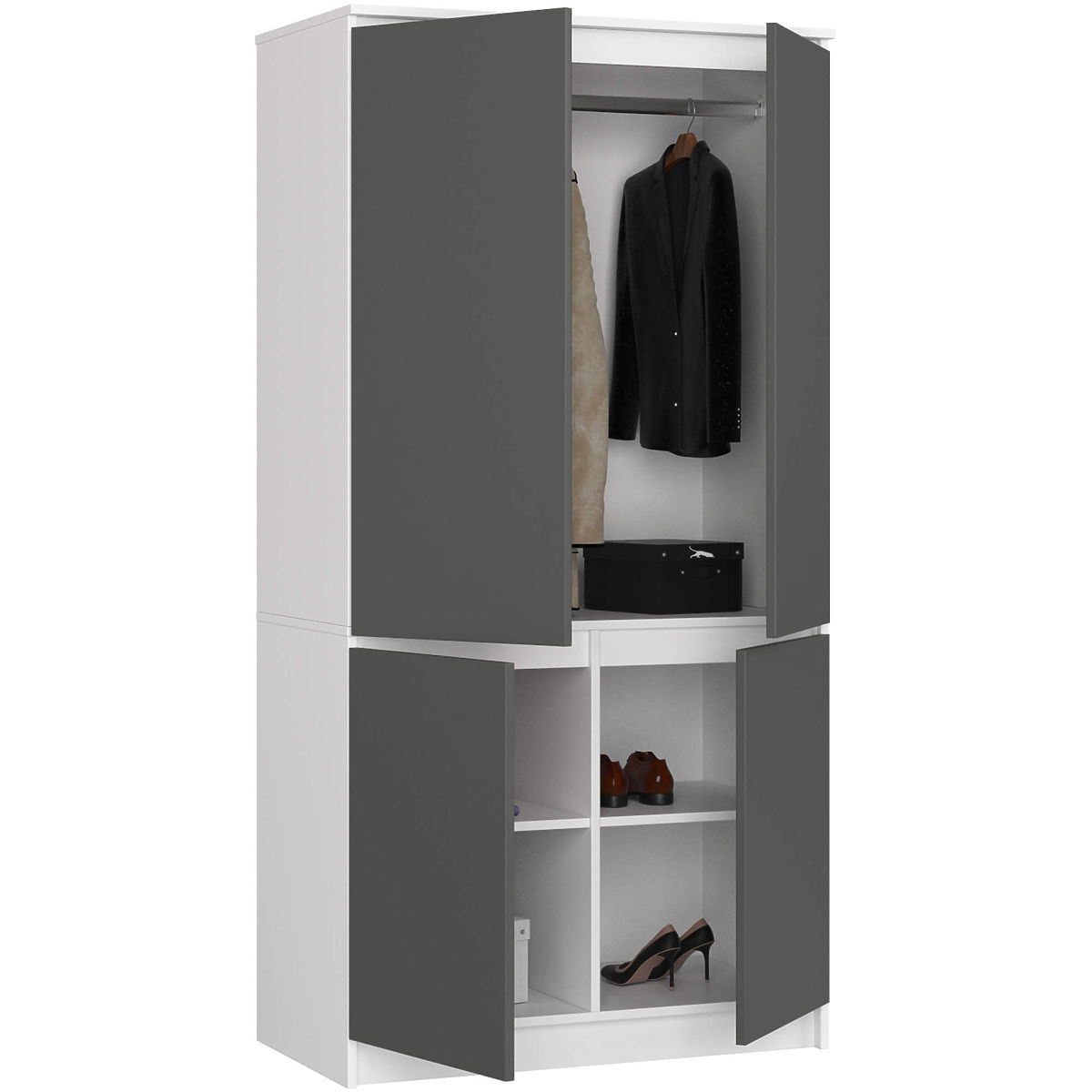 Der viertürige Schrank ist ein vielseitiges und praktisches Möbelstück, das hervorragend die Einrichtung von Schlafzimmer, Flur oder Wohnzimmer in Studiointerieurs ergänzt. Das elegante Design und die Farbgebung in Weiß und Graphitgrau machen den Schrank ideal für klassische und moderne Arrangements. Der Schrank ist mit geräumigen Regalböden ausgestattet, die sich ideal zur Aufbewahrung von Kleidungsstücken oder Ersatzbezügen für Decken und Kissen, Bettlaken, Tischdecken oder Decken eignen. Im Teil des Möbels hinter den Klapptüren befindet sich eine Kleiderstange. Die Regalböden können für Pullover, Blusen, Handtaschen, aber auch beispielsweise für Handtücher genutzt werden. Die Stange hingegen eignet sich als Platz zum Aufhängen von Anzügen, Kleidern, Röcken und Oberbekleidung wie Mänteln oder Jacken. Das Möbelstück zeichnet sich durch sorgfältige Verarbeitung aus hochwertigem laminiertem Plattenmaterial aus, das abriebfest ist. Die Kanten des Schranks wurden mit einer ästhetischen ABS-Kante abgeschlossen.