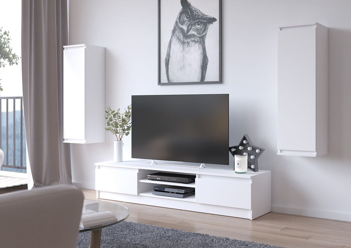 Das Möbelset, bestehend aus einem TV-Schrank und zwei Hängeschränken, kann eine funktionale Ausstattung für das Wohnzimmer, das Arbeitszimmer oder das Studentenzimmer sein. Der TV-Schrank hat eine große Platte, auf die ein Fernseher beliebiger Größe und dekorative Elemente gestellt werden können. Die Möbel sind mit praktischen Regalen für Elektronik und seitlichen Stauräumen mit Klapptüren ausgestattet, in denen DVDs, Computerzubehör oder andere Kleinigkeiten aufbewahrt werden können. Der TV-Schrank in Kombination mit den Hängeschränken an seinen Seiten bildet eine optisch attraktive Komposition. Die Möbel nehmen wenig Platz ein, was sie nicht nur für ein großes Wohnzimmer, sondern auch für kleinere Räume geeignet macht.
