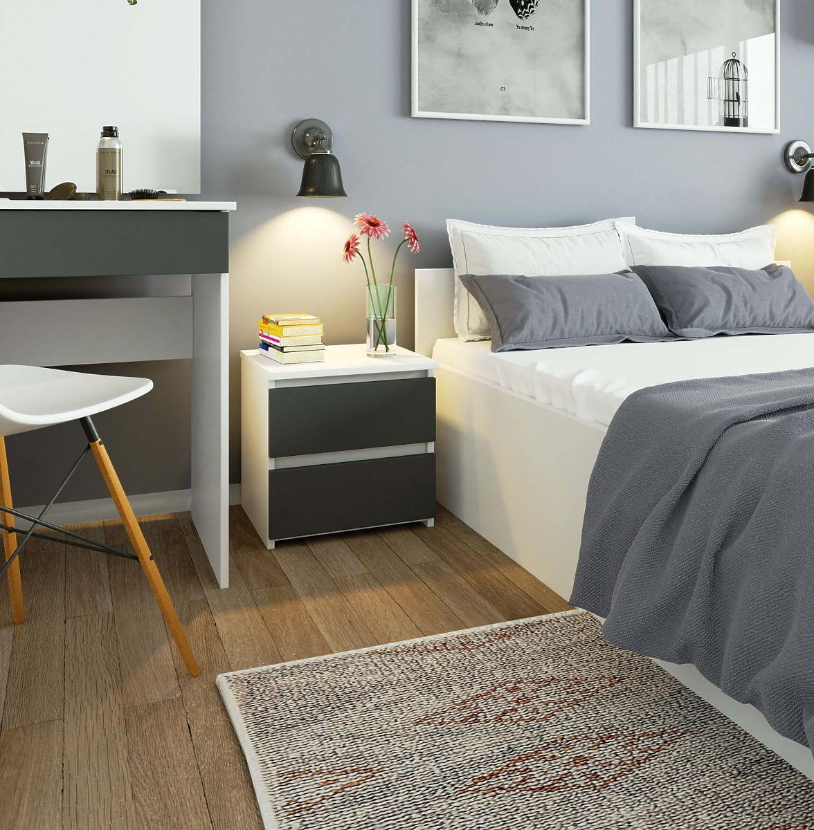 Nachttische sind eine beliebte Art von Möbeln, die neben dem Bett platziert werden. Auf der Tischplatte kann eine Lampe platziert werden, während in den Schubladen wichtige Gegenstände aufbewahrt werden können, die die Qualität von Ruhe und Schlaf verbessern. In unserem Angebot ist ein weißer Nachttisch CL2 40 cm mit Schubladenfronten in Grafitgrau erhältlich. Er wirkt elegant und modern und ist gleichzeitig funktional. Er passt perfekt in jedes Schlafzimmer und Jugendzimmer.