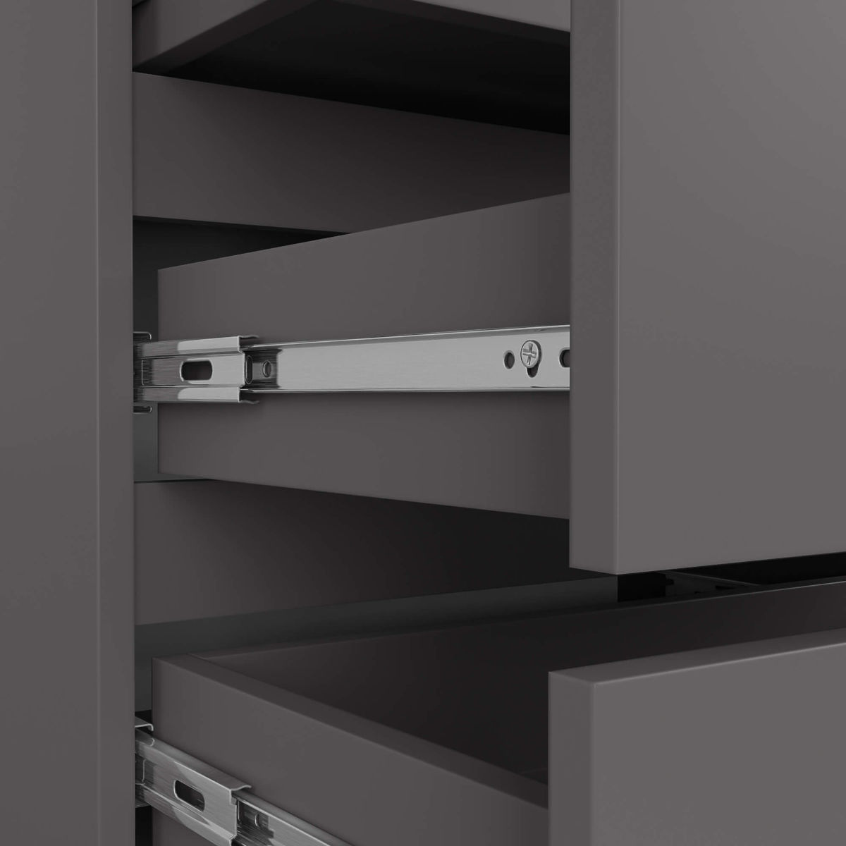 - Schubladen laufen auf Metallkugelführungen