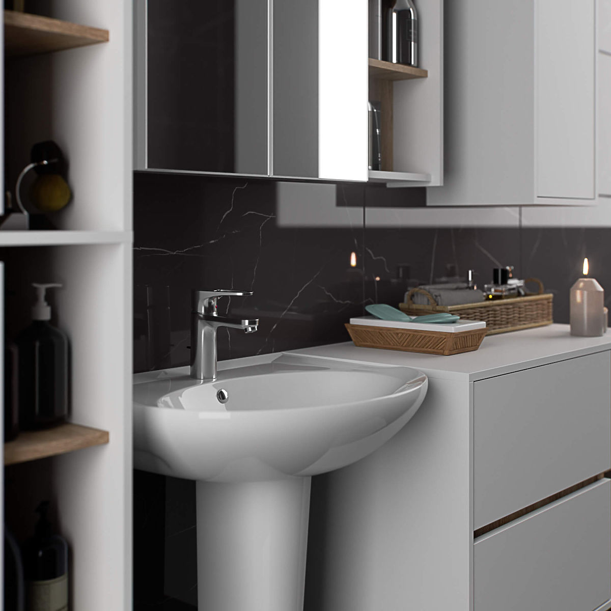 Badezimmerschränke ergänzen hervorragend die Badezimmereinrichtung, bieten den notwendigen Platz für alle Kosmetika und Reinigungsmittel und verleihen dem Badezimmer einen bestimmten Stil. Geräumige Schränke erleichtern die Ordnung im Raum, was sich positiv auf die Ästhetik des Innenraums auswirkt. Die VAMI-Kollektion zeichnet sich durch eine auffällige stilvolle Farbgebung aus – Korpus und Fronten haben die gleiche Farbe, während die Innenfarbe anders ist.