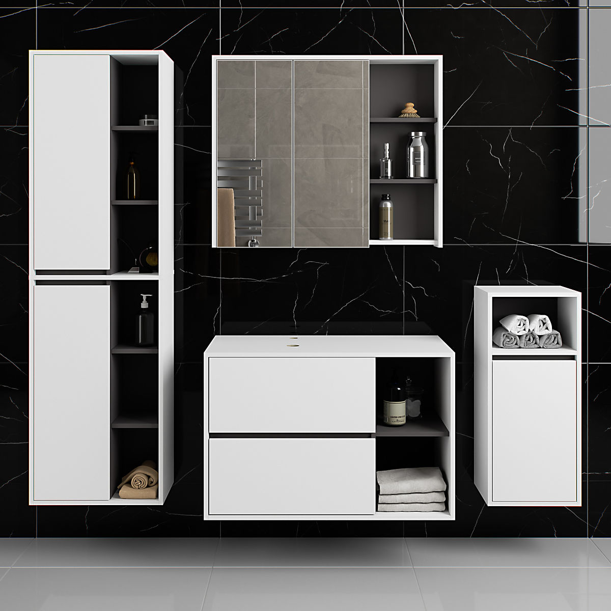Die Schränke sind unabhängig, was ihre Anordnung in beliebiger Konfiguration und Abständen nach eigenen Bedürfnissen ermöglicht. Der Preis bezieht sich nur auf die Badezimmerschränke, dekorative Elemente sind nicht im Set enthalten.