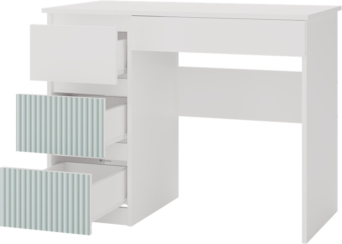 3 geräumige hohe Schubladen auf der linken Seite (davon 2 Schubladen mit mintfarbenen Mustern) und 1 flache Schublade auf der rechten Seite unter der Tischplatte