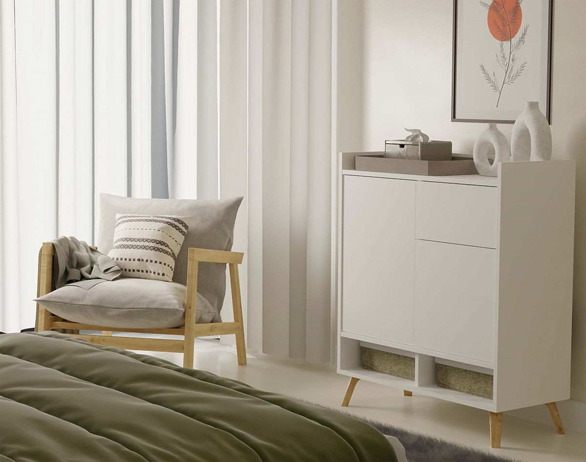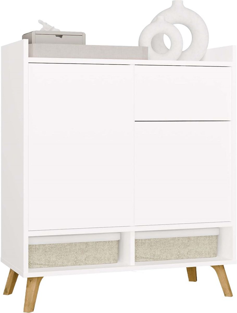 Elegante weiße Kommode mit Türen und Schublade im skandinavischen Stil. .. mehr