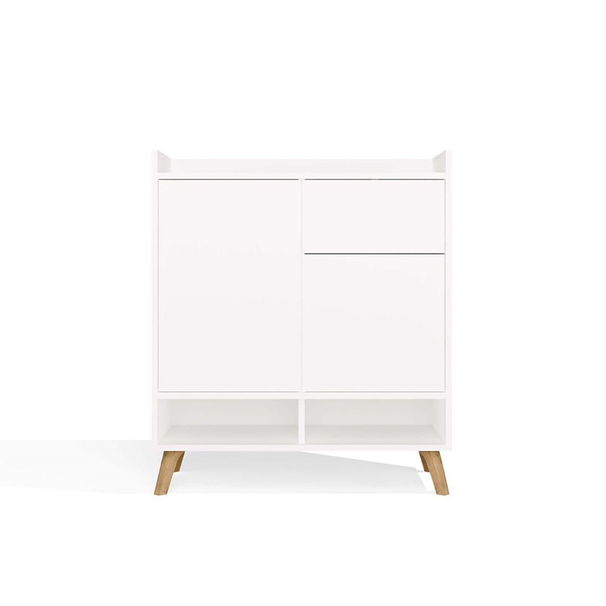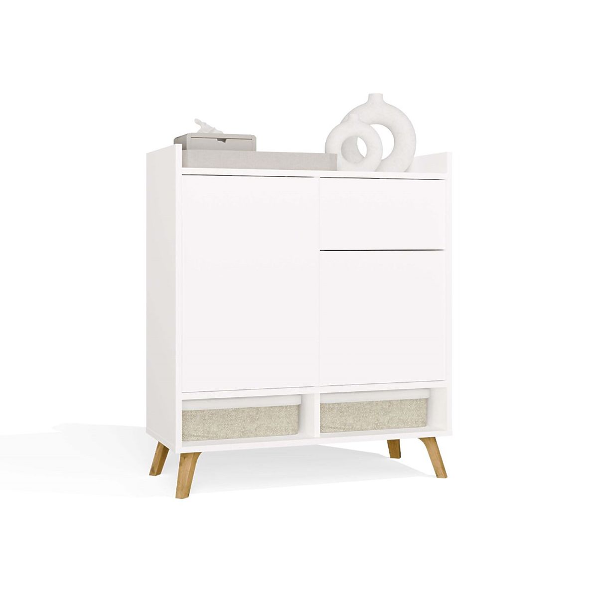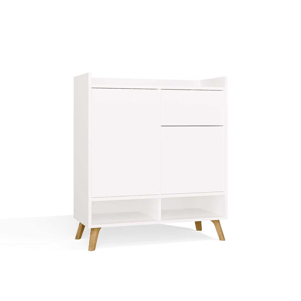 Die einfache Form, grifflose Fronten und hohe Beine im skandinavischen Stil verleihen der Kommode Leichtigkeit und einen modernen Charakter.
