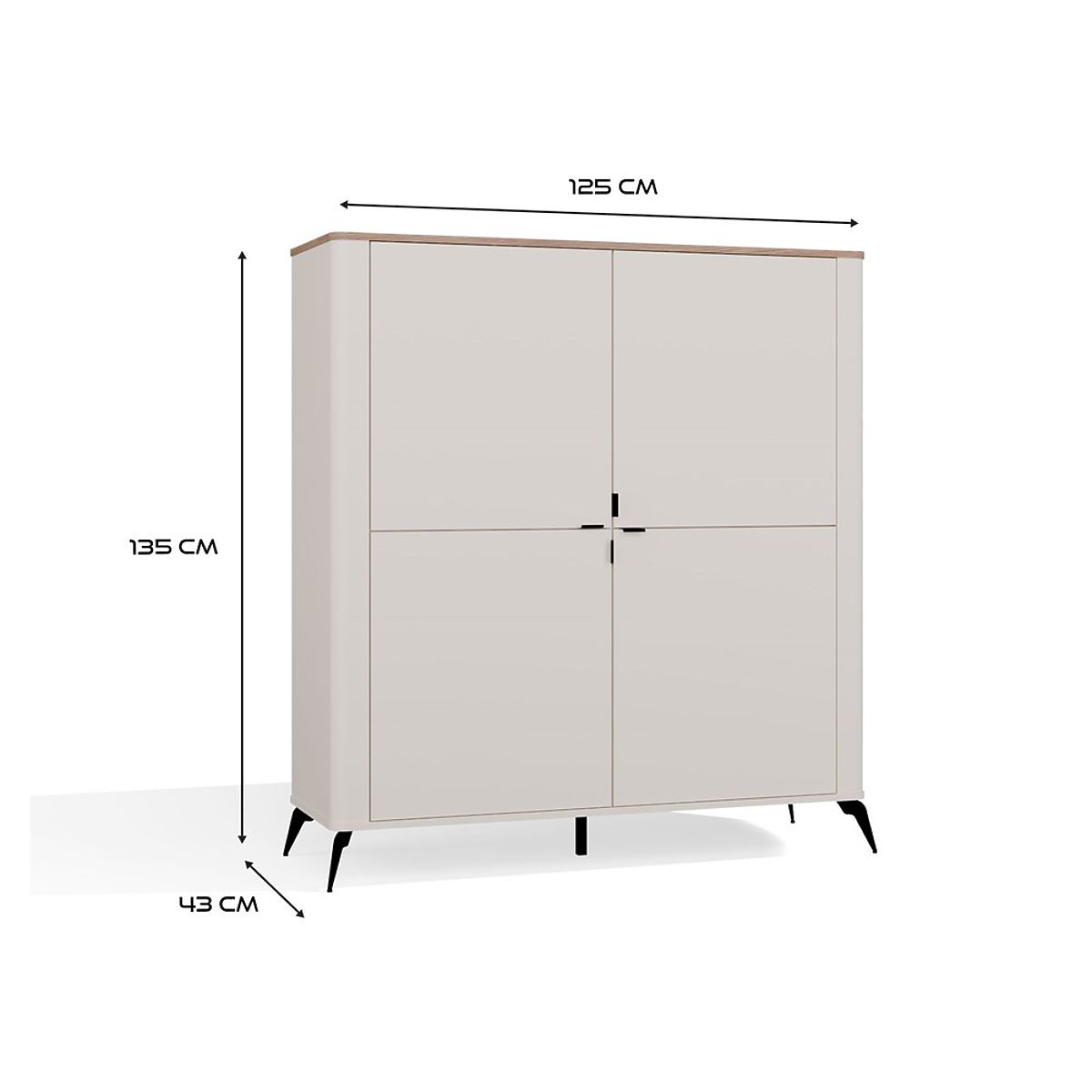 Das Modell ist mit vier Fronten mit Soft-Close-Funktion ausgestattet, hinter denen sich bis zu acht praktische Regale verbergen – ideal zur Aufbewahrung von Büchern, Dokumenten, Textilien oder Alltagsgegenständen.