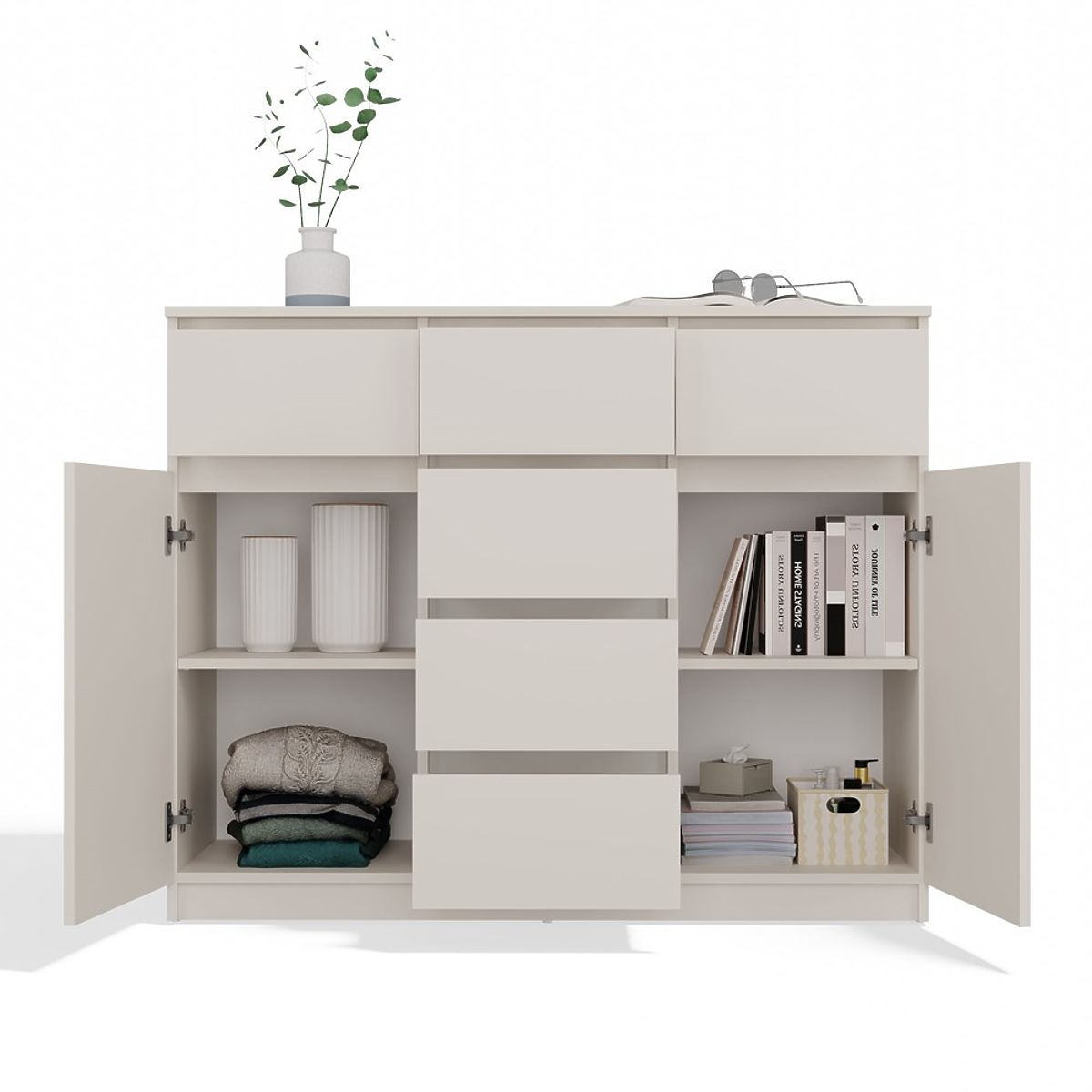 Geräumigkeit und Funktionalität: Die Kommode ist mit 2 Türen und 6 geräumigen Schubladen ausgestattet, die bei der Organisation Ihres Raumes helfen. Ideal für Schlafzimmer, Wohnzimmer, Kinderzimmer oder Flur – überall dort, wo zusätzlicher Stauraum benötigt wird.