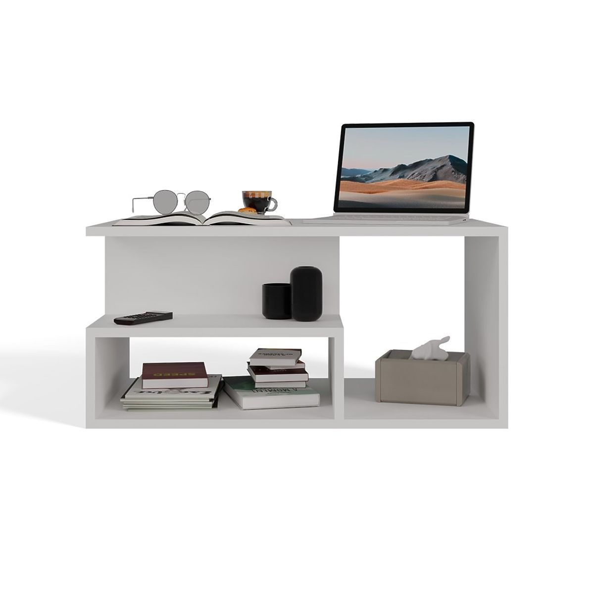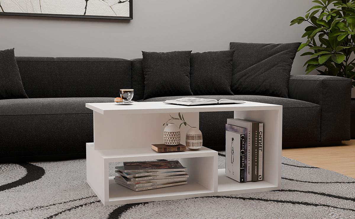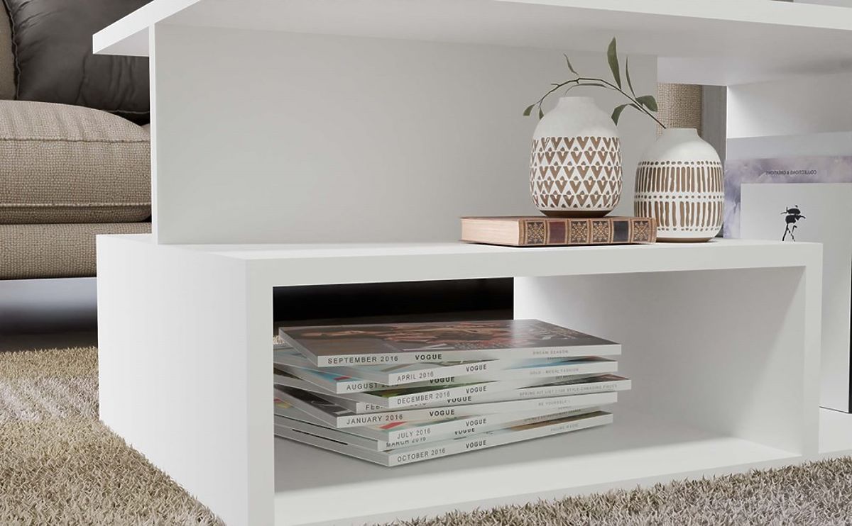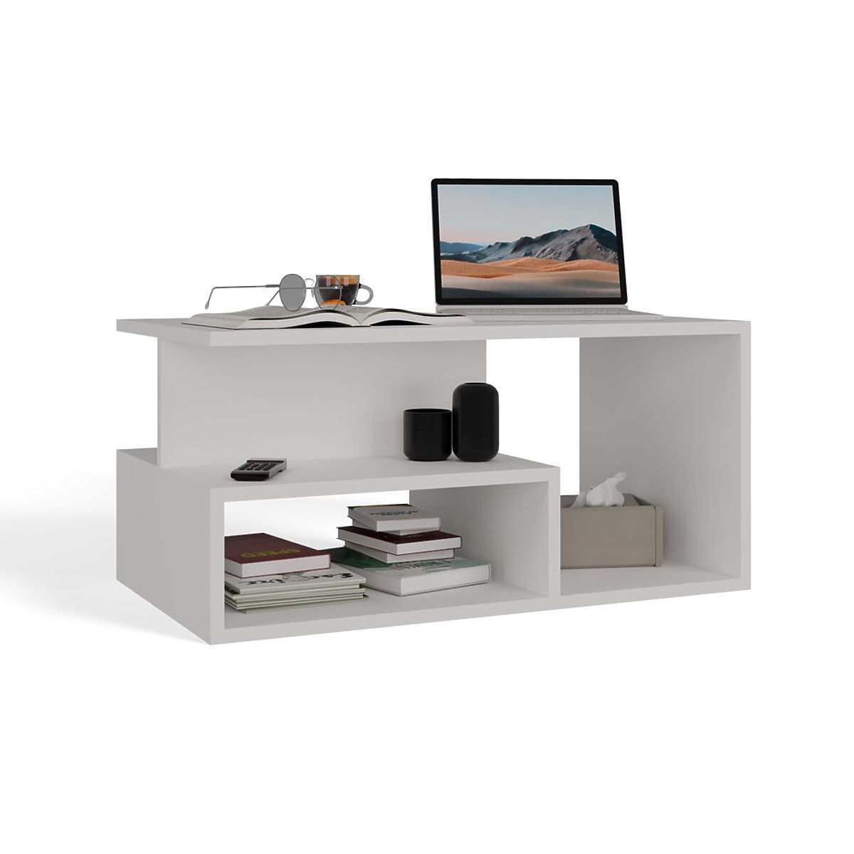 Moderner Couchtisch aus weißem laminiertem Brett. .. mehr