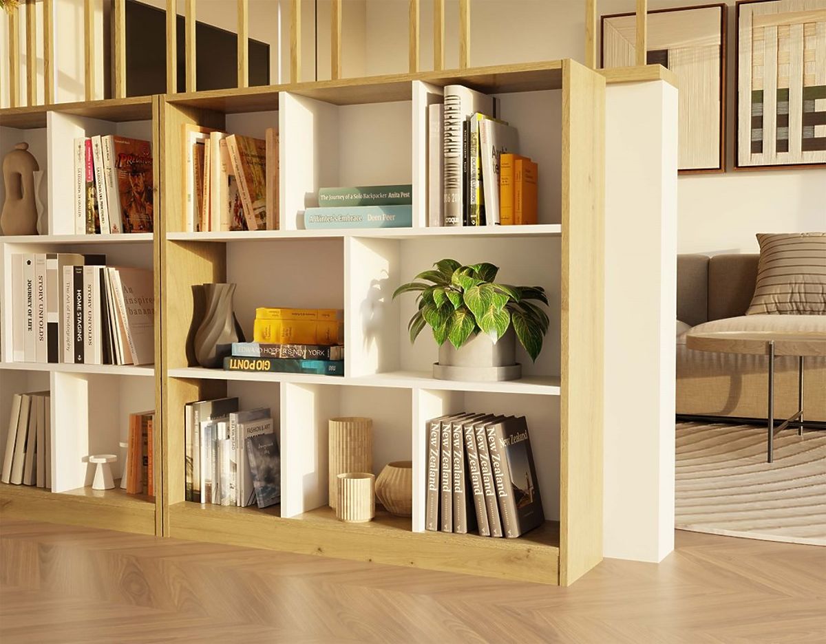 Es verfügt über 8 geräumige Fächer, die bei der Organisation des Raumes helfen und eine ästhetische Präsentation Ihrer Lieblingsgegenstände ermöglichen. Die Kombination aus dem warmen Farbton der Eiche Artisan und den kontrastierenden weißen Regalböden verleiht dem Möbelstück einen modernen und eleganten Charakter.