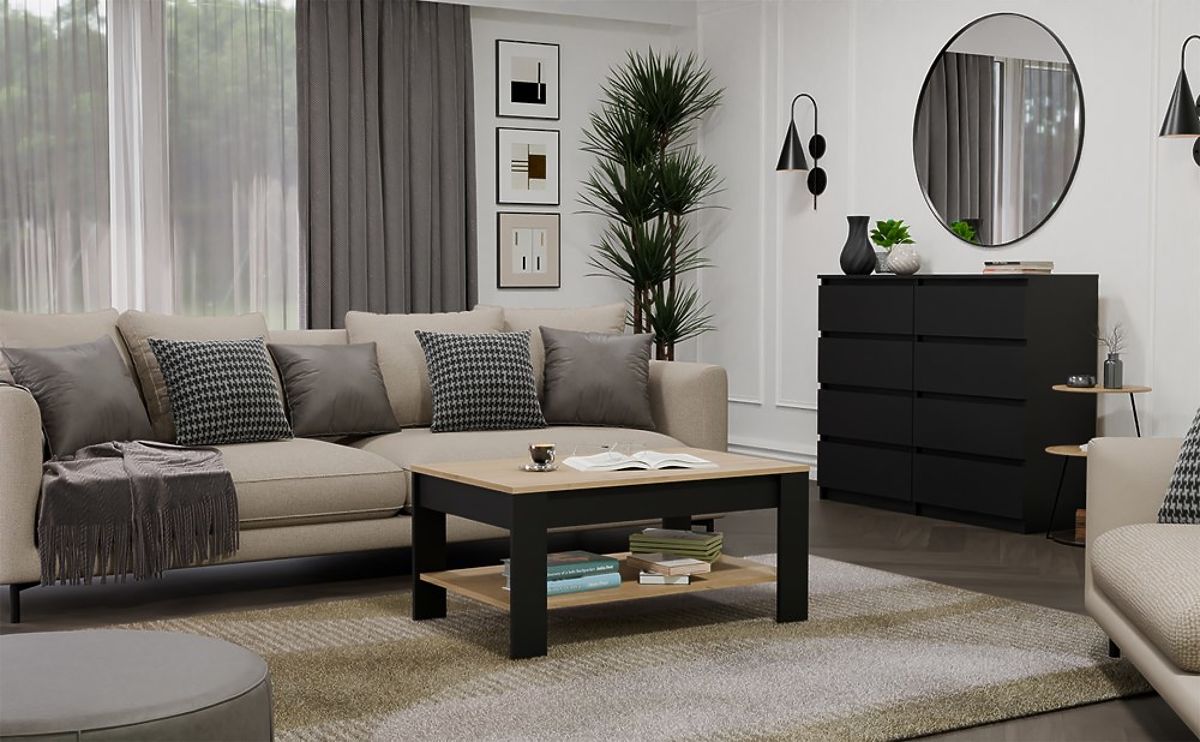 Der moderne Couchtisch OHIO ist die perfekte Ergänzung für das Wohnzimmer, den Aufenthaltsraum oder die Entspannungsecke. Die Kombination aus Eiche Artisan Dekor und mattem Schwarz verleiht dem Möbelstück einen modernen und eleganten Charakter. Die minimalistische Form und das funktionale untere Regal sorgen dafür, dass das Möbelstück nicht nur ästhetisch, sondern auch sehr praktisch für den täglichen Gebrauch ist.