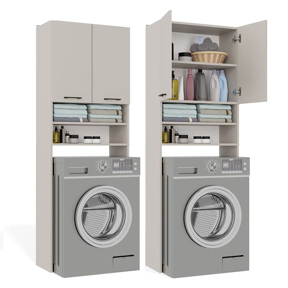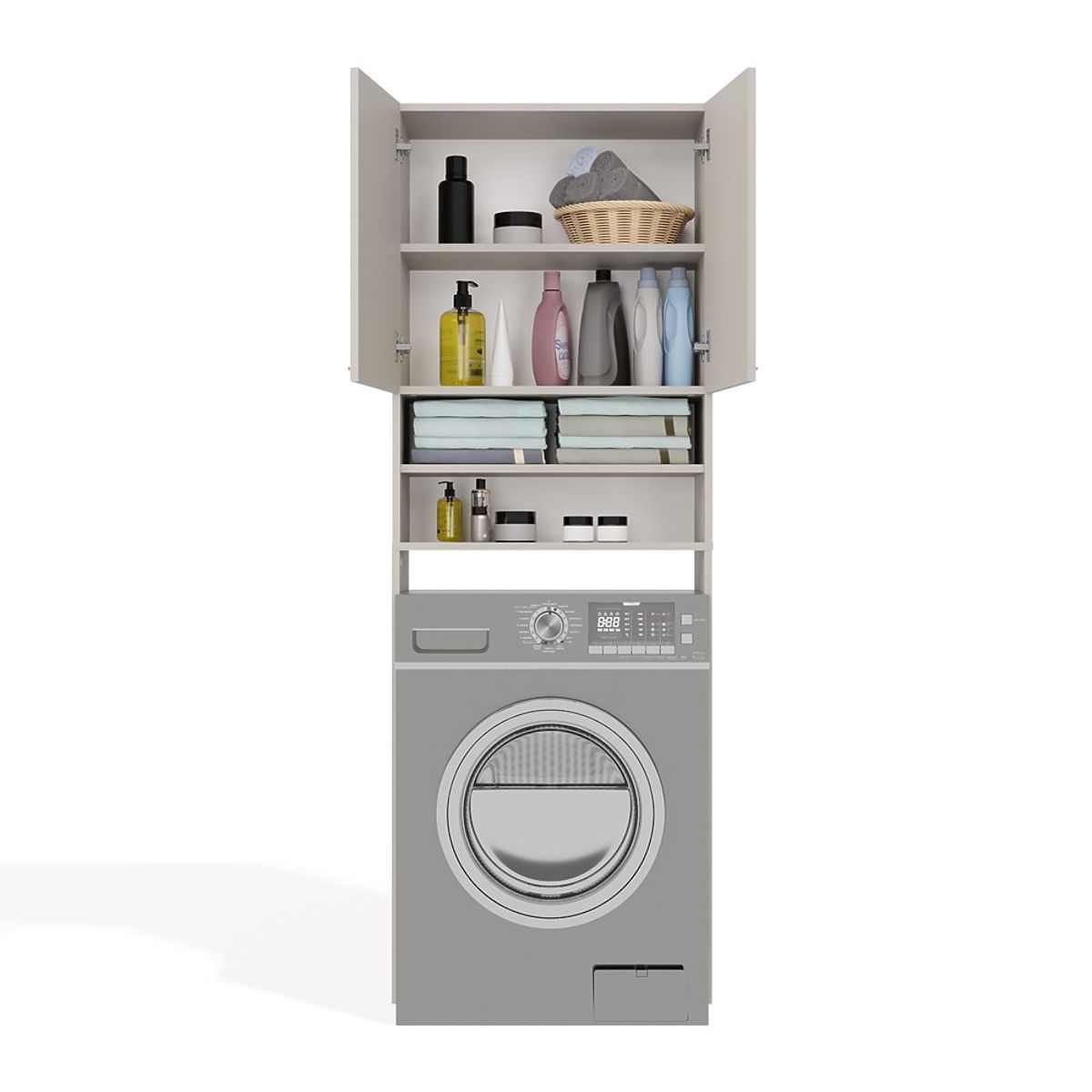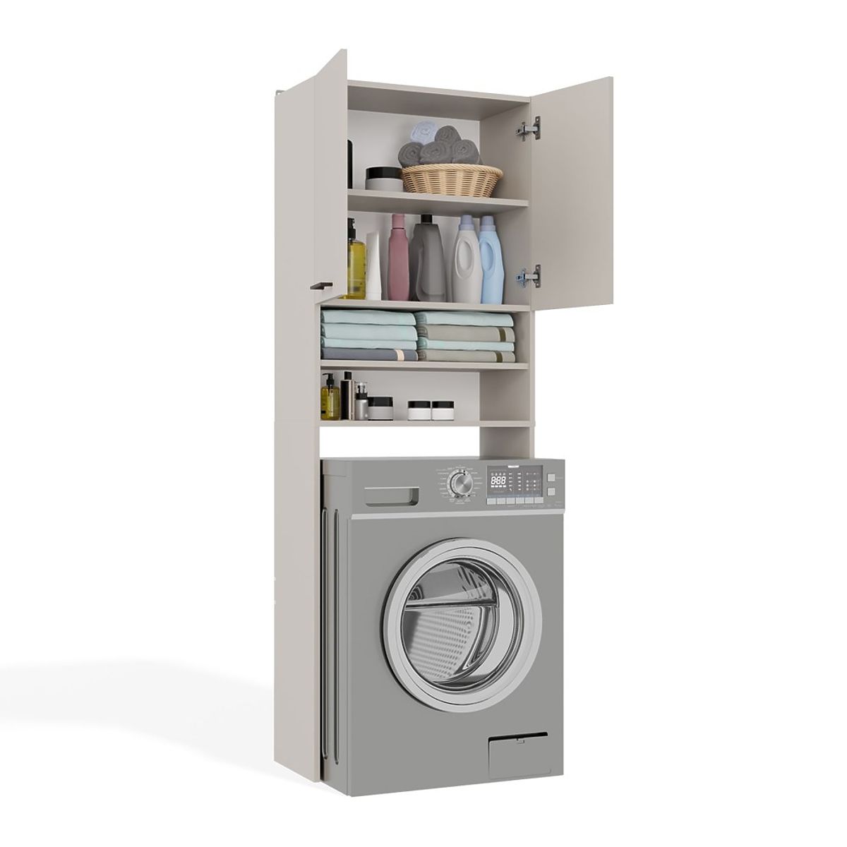 Es stehen insgesamt 4 praktische Regale zur Verfügung, davon 2 Regale, die hinter doppelten, kurzen Türen verborgen sind. Sie bieten problemlos Platz für Handtücher, Reinigungsmittel, Waschmittel oder Kosmetik.