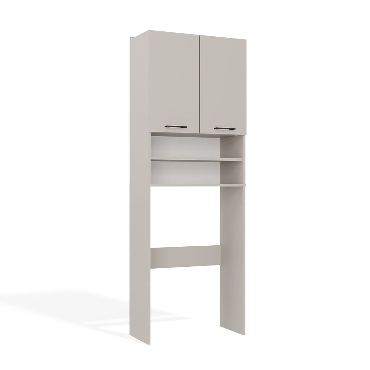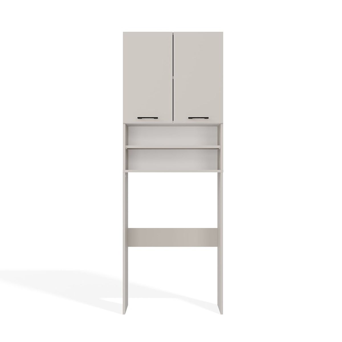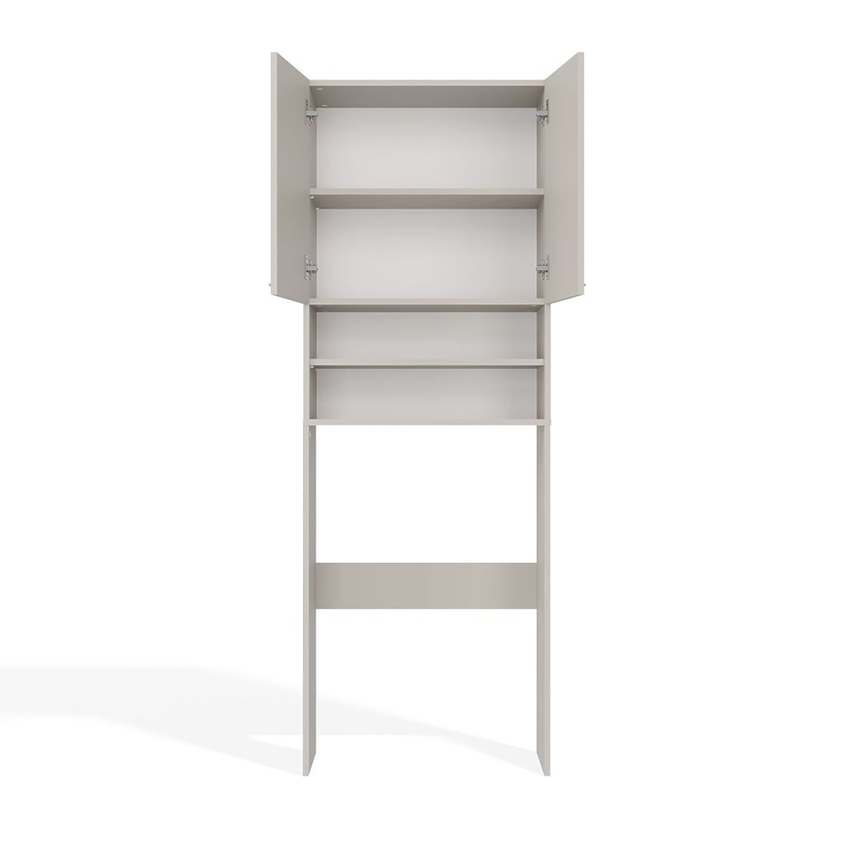 Es stehen insgesamt 4 praktische Regale zur Verfügung, davon 2 Regale, die hinter doppelten, kurzen Türen verborgen sind. Sie bieten problemlos Platz für Handtücher, Reinigungsmittel, Waschmittel oder Kosmetik.