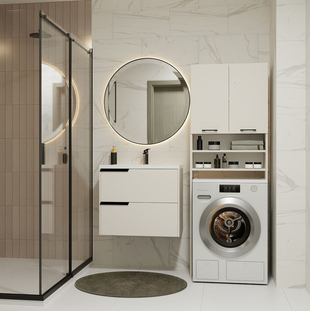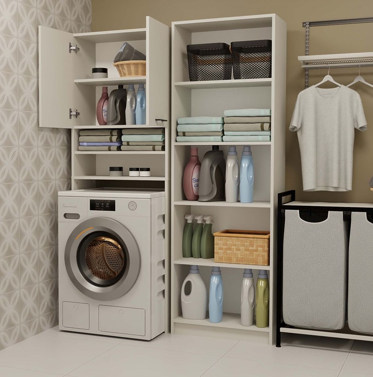 4 geräumige Regale, davon 2 hinter Türen verborgen – ideal für Handtücher, Waschmittel und Zubehör.
