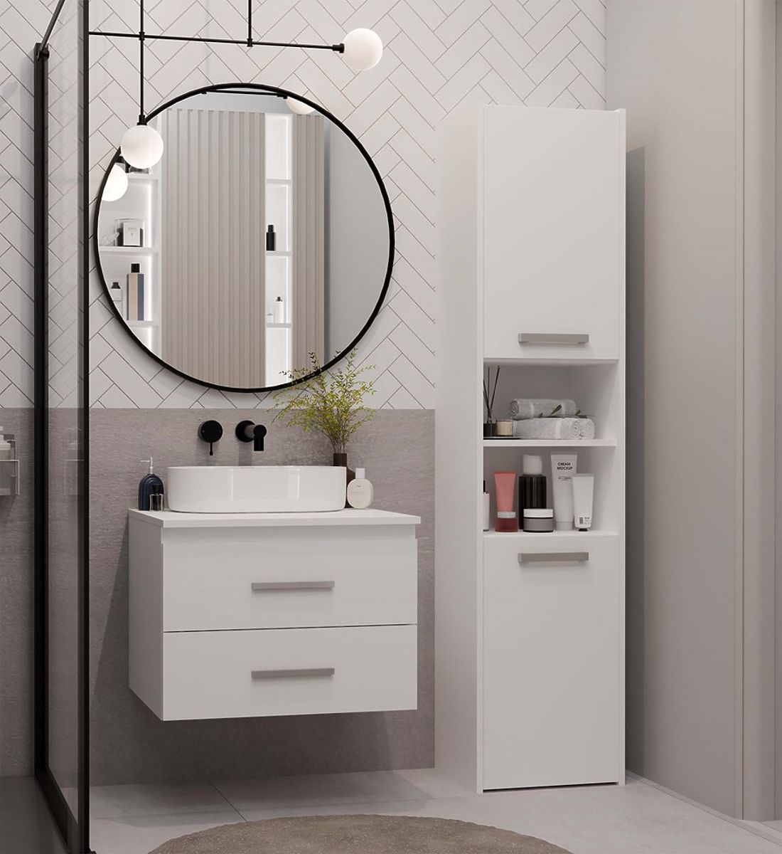 NEL 60 ist ein kompakter und praktischer Badezimmerschrank, der sich hervorragend für moderne Innenräume eignet, sowohl für größere als auch kleinere.