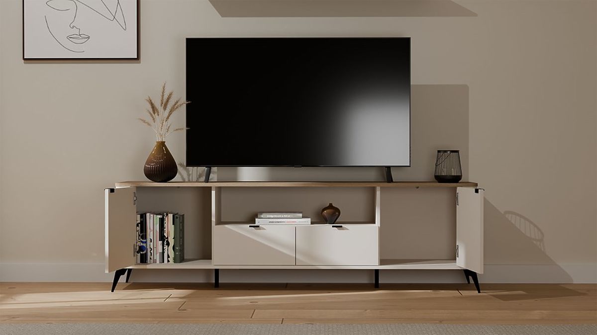 Der TV-Schrank CORDOBA 2D2S ist ein modernes Design aus der außergewöhnlichen Cordoba-Kollektion, die die Eleganz der beigen Kaschmirfarbe mit der Wärme der natürlichen Platte im Eiche-Castello-Dekor verbindet. Die minimalistische Form, abgerundete Seiten und markante Details machen dieses Möbelstück nicht nur funktional, sondern auch zu einem ästhetischen Element jedes Wohnzimmers.