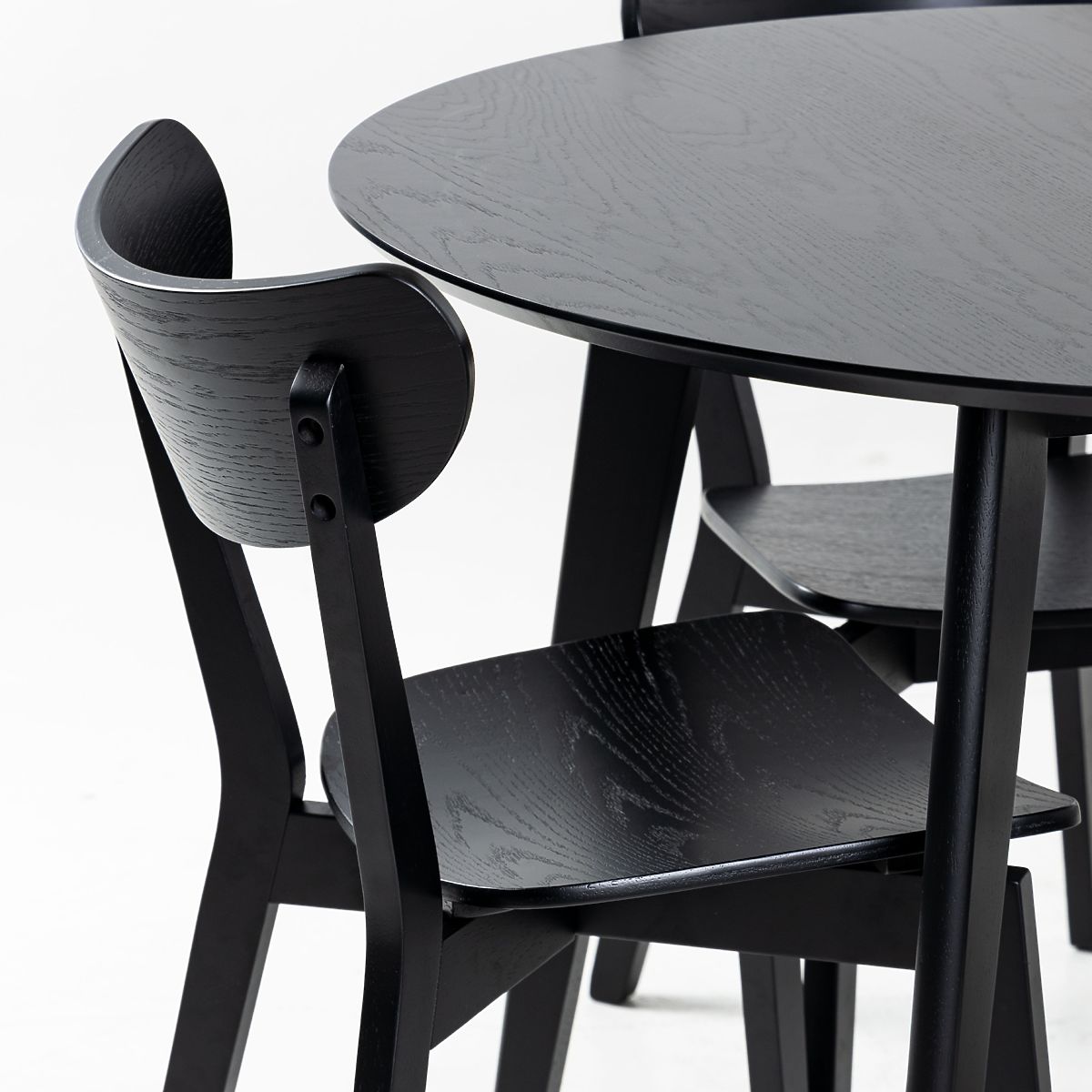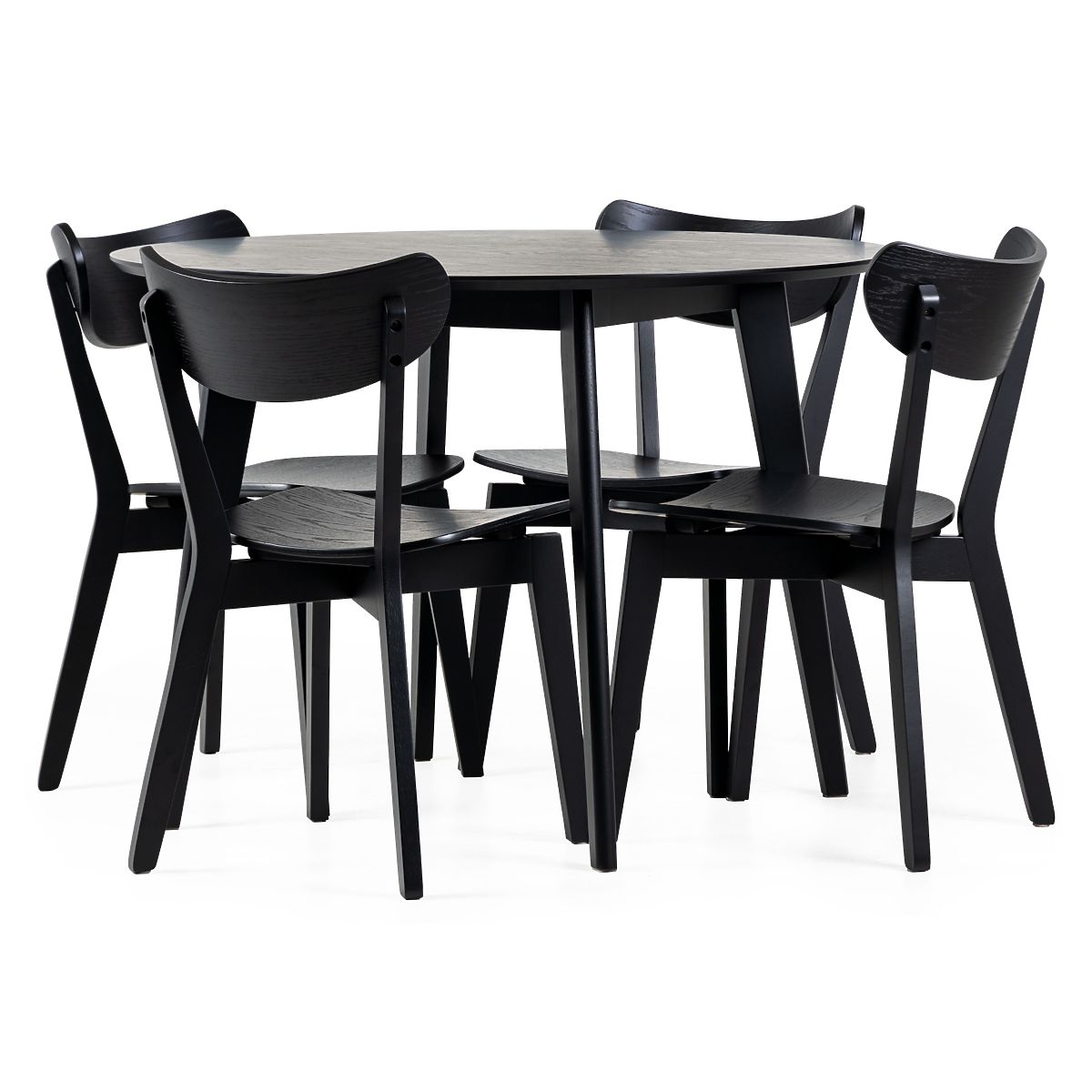 Die Essgruppe Roxby passt perfekt in eine klassische Küche oder ein Esszimmer. Das Set enthält einen runden Tisch und vier schwarze Stühle. Der Tisch mit den Stühlen ist zeitlos. Das einfache und minimalistische Design von Tisch und Stühlen passt in jedes Interieur. Die schwarze Farbe bietet viele Gestaltungsmöglichkeiten. Die Essgruppe zeichnet sich durch solide Verarbeitung aus, wodurch die Möbel langlebig und robust sind. Dieses Set wird Kunden ansprechen, die universelle und sehr funktionale Lösungen schätzen. Die Essgruppe Roxby eignet sich dank ihrer kompakten Abmessungen für die Küche oder das Wohnzimmer. Der Tisch Roxby bietet Platz für 4 Personen.