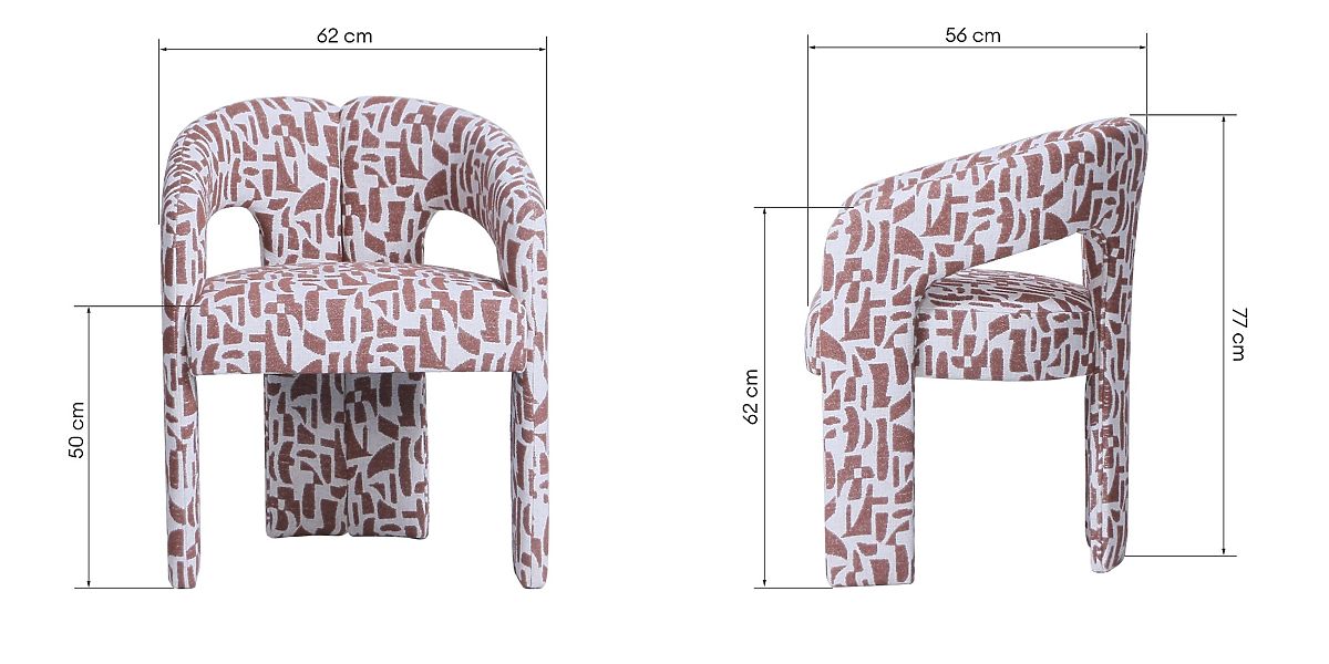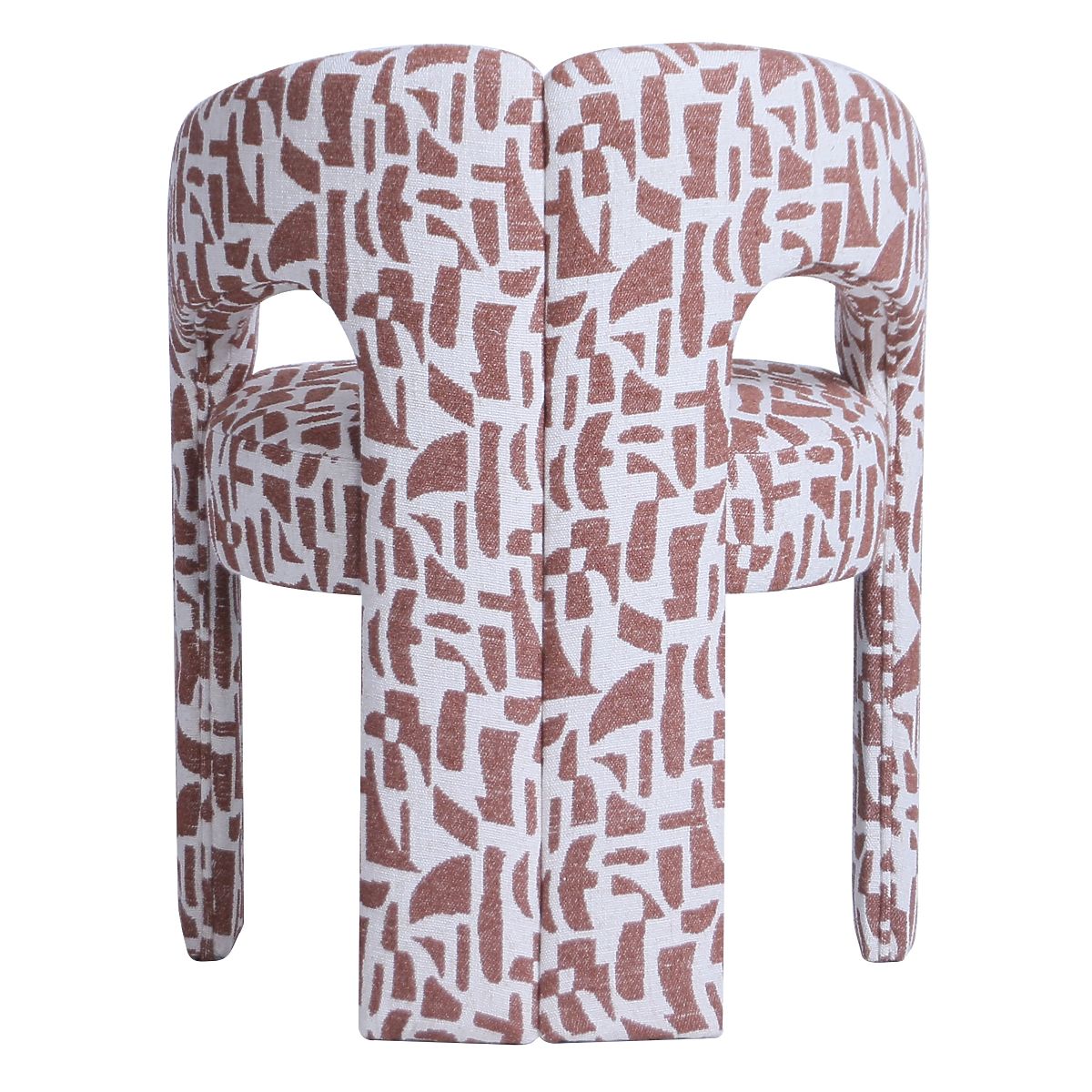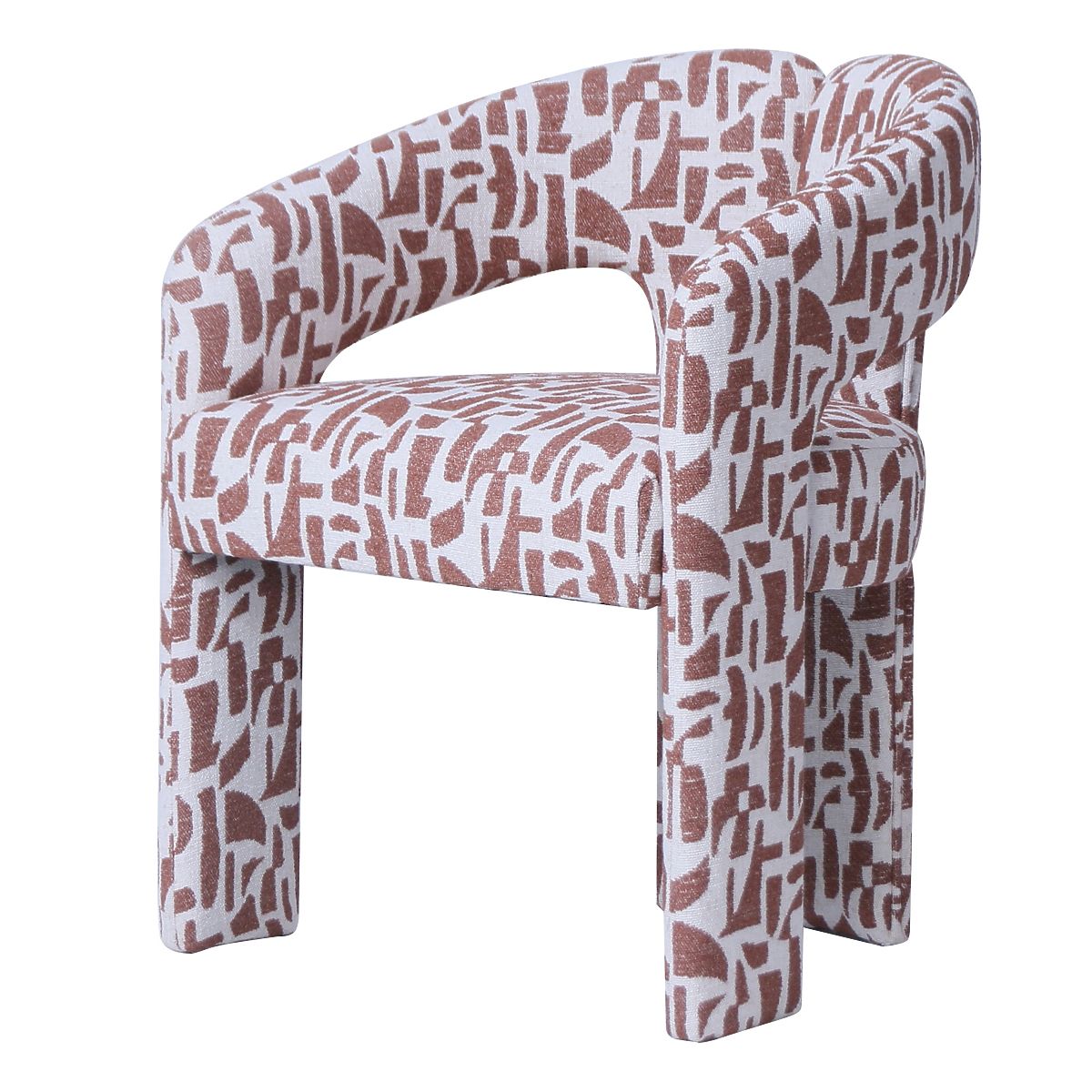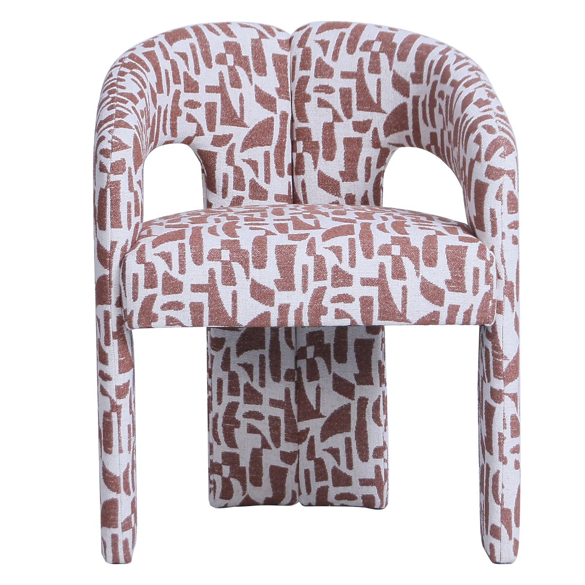 Gepolsterter Stuhl mit burgunderbraunem Stoff und bogenförmigem Design. .. mehr