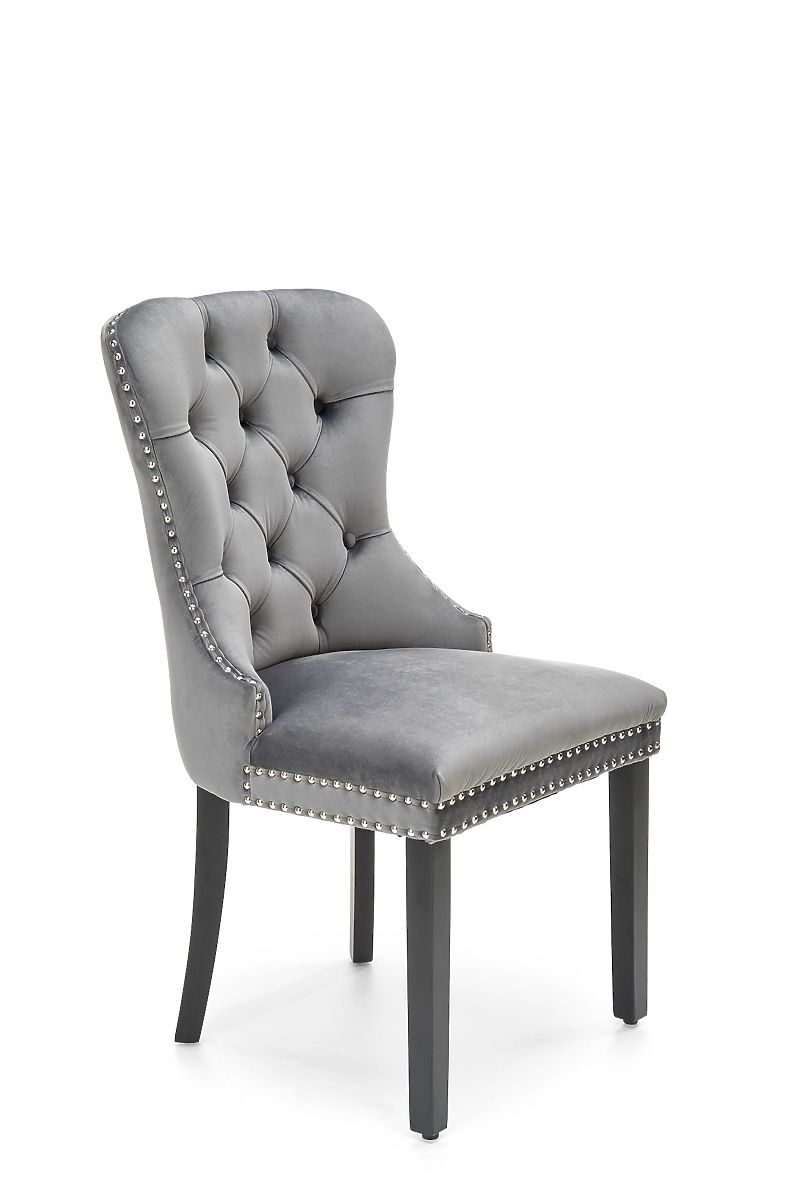 Stuhl aus Massivholz mit grauem Samtbezug. .. mehr