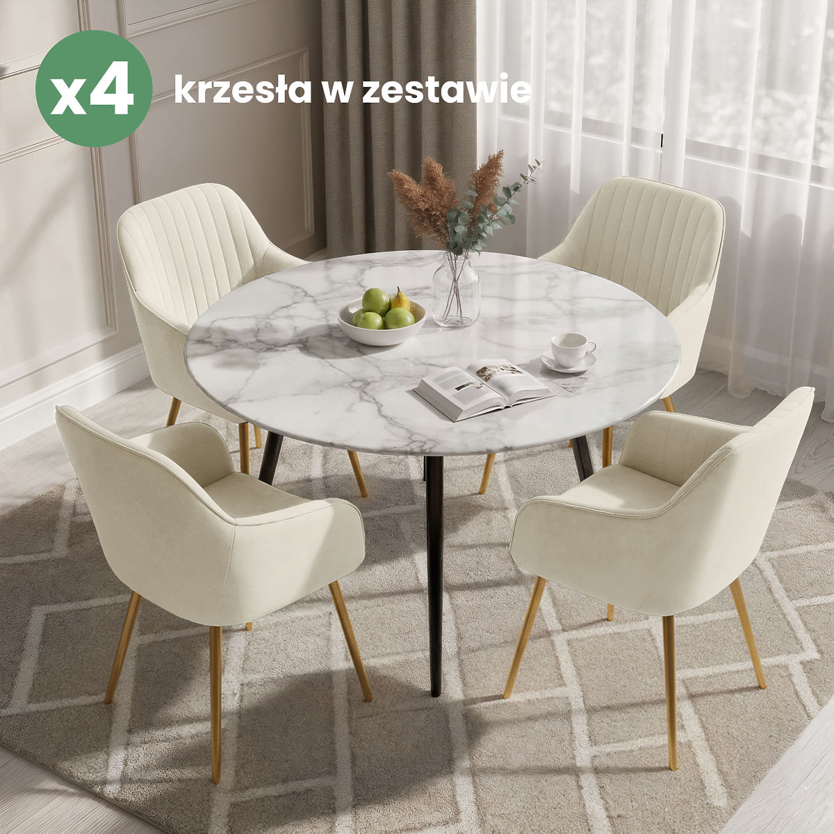 Lukahome.at » Jídelna a kuchyně / Jídelní židle / 4x Samtgepolsterter Stuhl mit Steppung Creme FLORENCE Goldene Beine