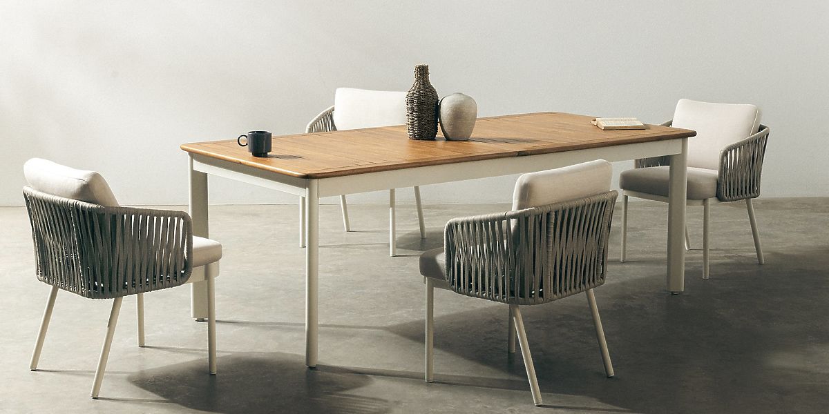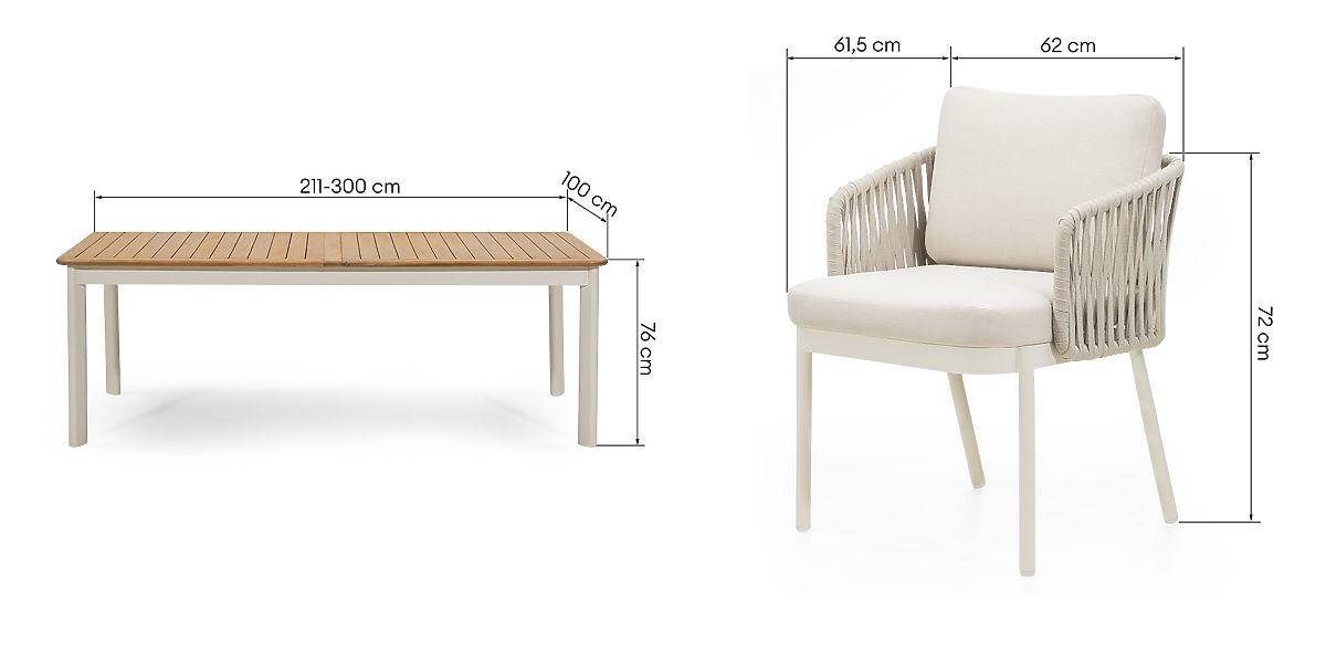 Das Gartenset Porticato ist die Quintessenz modernen Designs und Komforts. Es besteht aus einem ausziehbaren Tisch und vier stilvollen Stühlen, die zusammen einen funktionalen und ästhetischen Raum für Erholung im Freien schaffen. Die hellbeige Farbgebung, die Kombination aus Holz und Metall sowie sorgfältig ausgewählte Details sorgen dafür, dass das Set sowohl mit dem Grün des Gartens als auch mit einer modernen Terrasse perfekt harmoniert. Sowohl der Tisch als auch die Stühle Porticato haben eine leichte, aber dennoch stabile Konstruktion aus hellbeige pulverbeschichtetem Aluminium. Diese Lösung garantiert Korrosions- und mechanische Beständigkeit. Die ausziehbare Tischplatte, aus langlebigem Akazienholz mit Teak-Finish, ermöglicht es, die Länge je nach Anzahl der Gäste und Anlass anzupassen. Ein weiterer Vorteil ist das FSC®-Zertifikat, das die Herkunft des Holzes aus verantwortungsvoll bewirtschafteten Quellen bestätigt. Die Stühle bestechen durch außergewöhnlichen Komfort – dank der geflochtenen Rückenlehnen aus langlebigem Seil und weichen Kissen aus hydrophobem Stoff. Es ist der perfekte Ort, um mit einer Tasse Kaffee, einem Buch oder bei langen Gesprächen mit Freunden zu entspannen. Möbel aus Naturholz bewahren ihre charakteristischen Eigenschaften, daher werden alle Unebenheiten, Kratzer, Risse, Knoten, Spalten, Löcher, Vertiefungen, unebene Kanten, unterschiedliche Maserungen, Farbunterschiede und andere Unregelmäßigkeiten in der Struktur während des Herstellungsprozesses bewusst beibehalten. Diese Eigenschaften unterstreichen die Authentizität des Materials und verleihen jedem unserer Produkte einen einzigartigen Charakter, was zu Unterschieden im Aussehen im Vergleich zu den präsentierten Fotos führen kann. Um das Set in einwandfreiem Zustand zu halten, wird empfohlen, es in der Wintersaison an einem trockenen und belüfteten Ort unter einem Unterstand zu lagern, um es vor Witterungseinflüssen zu schützen.