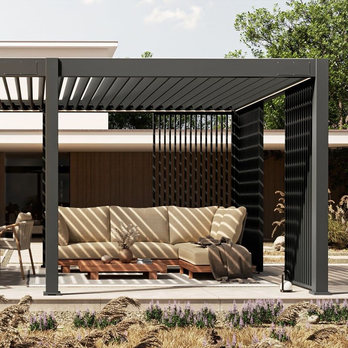 Freistehende bioklimatische Pergola mit LED-Beleuchtung und beweglichen Lamellen. .. mehr