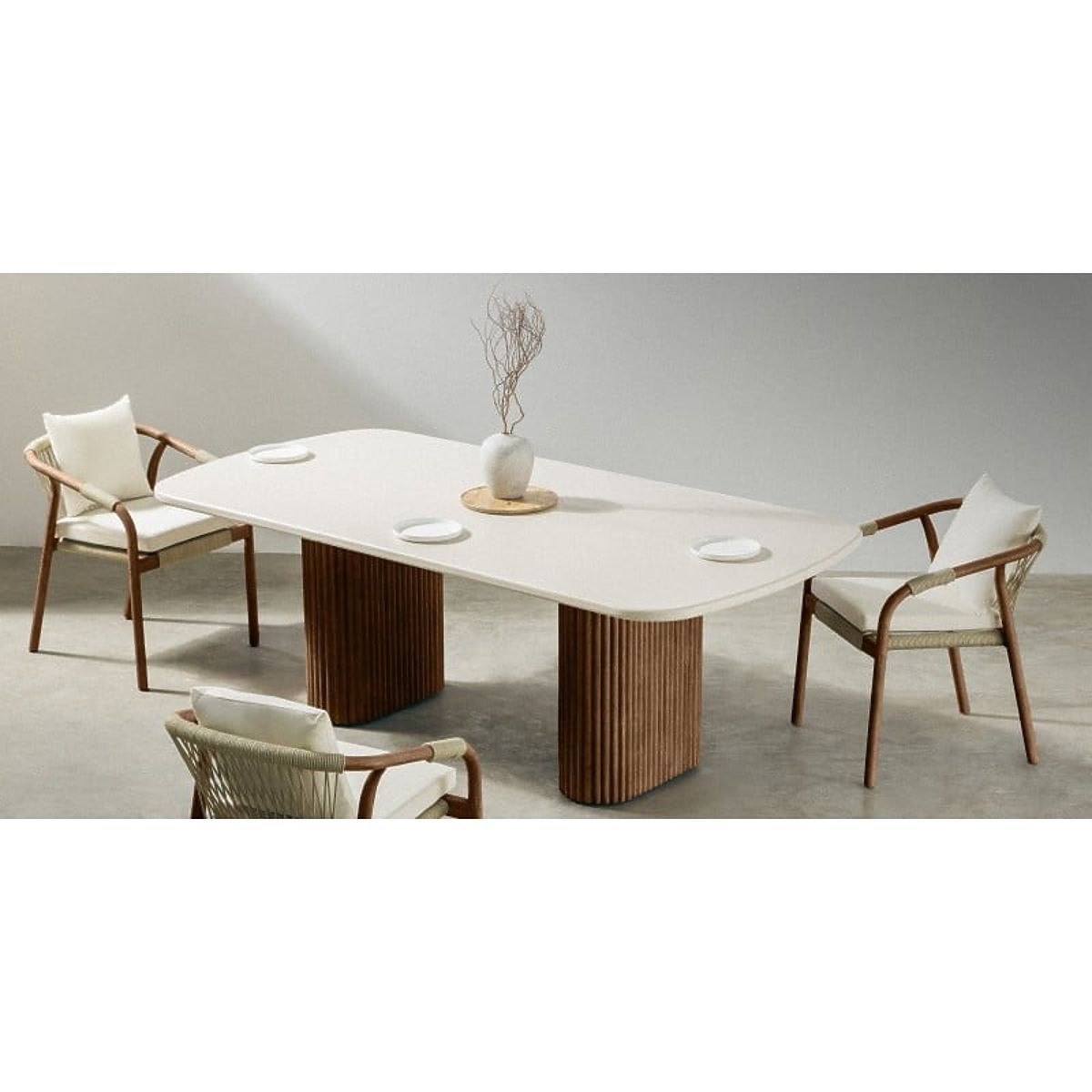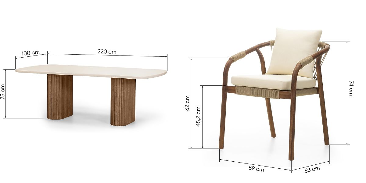 Das zentrale Element des Sets ist ein Tisch mit einer hellbeigen Platte, hergestellt aus dem innovativen Material Superstone – einem Verbundstoff, der natürlichen Stein perfekt imitiert, aber viel widerstandsfähiger gegen Witterungseinflüsse und UV-Strahlung ist. Seine sanft abgerundeten Kanten verleihen Leichtigkeit, während die massiven Lamellenbeine aus Akazienholz Eleganz unterstreichen und einen warmen, natürlichen Charakter verleihen.
