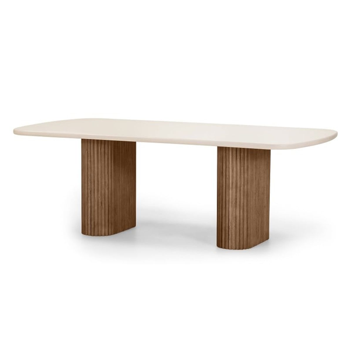 - Tisch mit hellbeiger Platte und abgerundeten Kanten