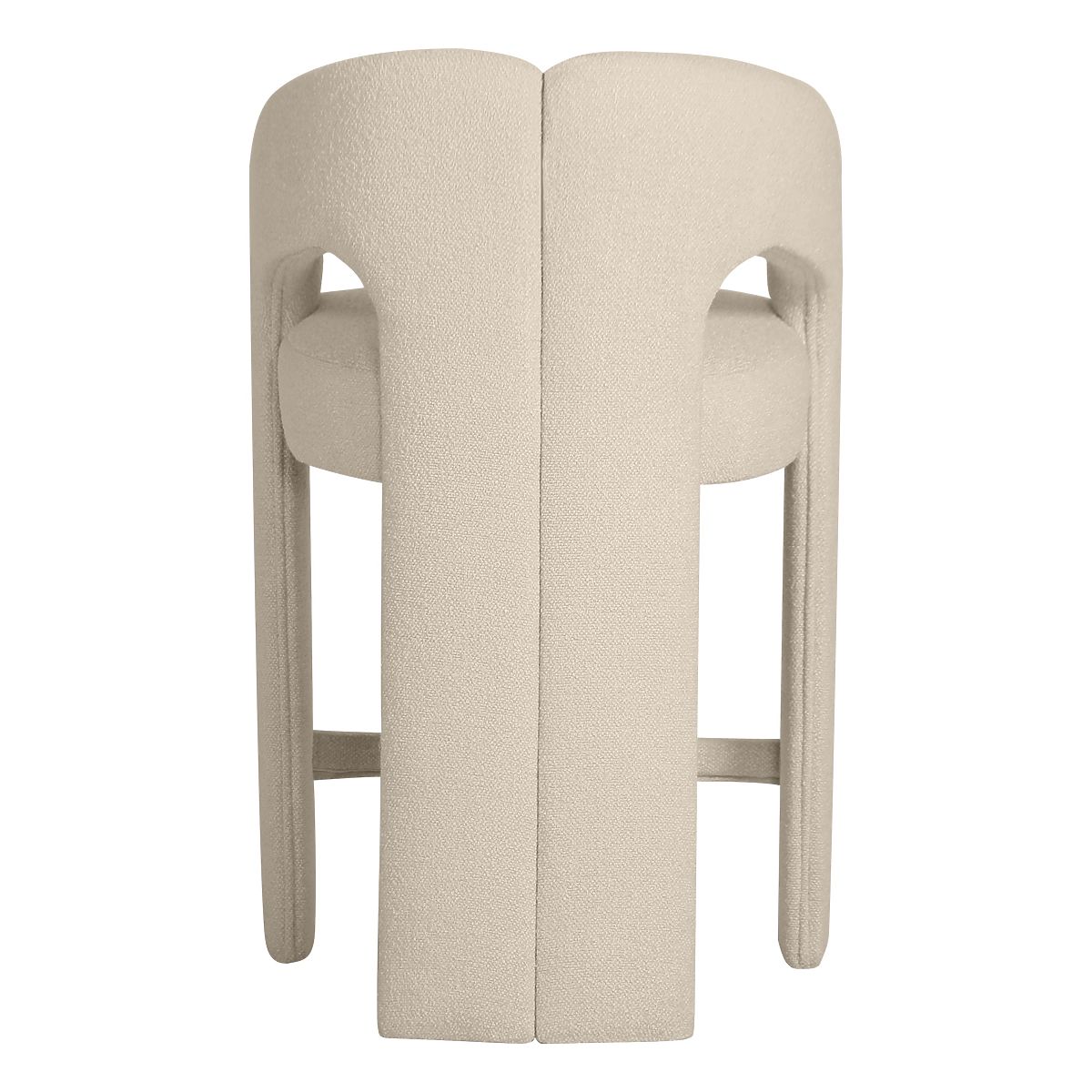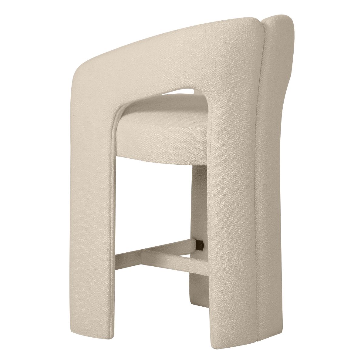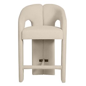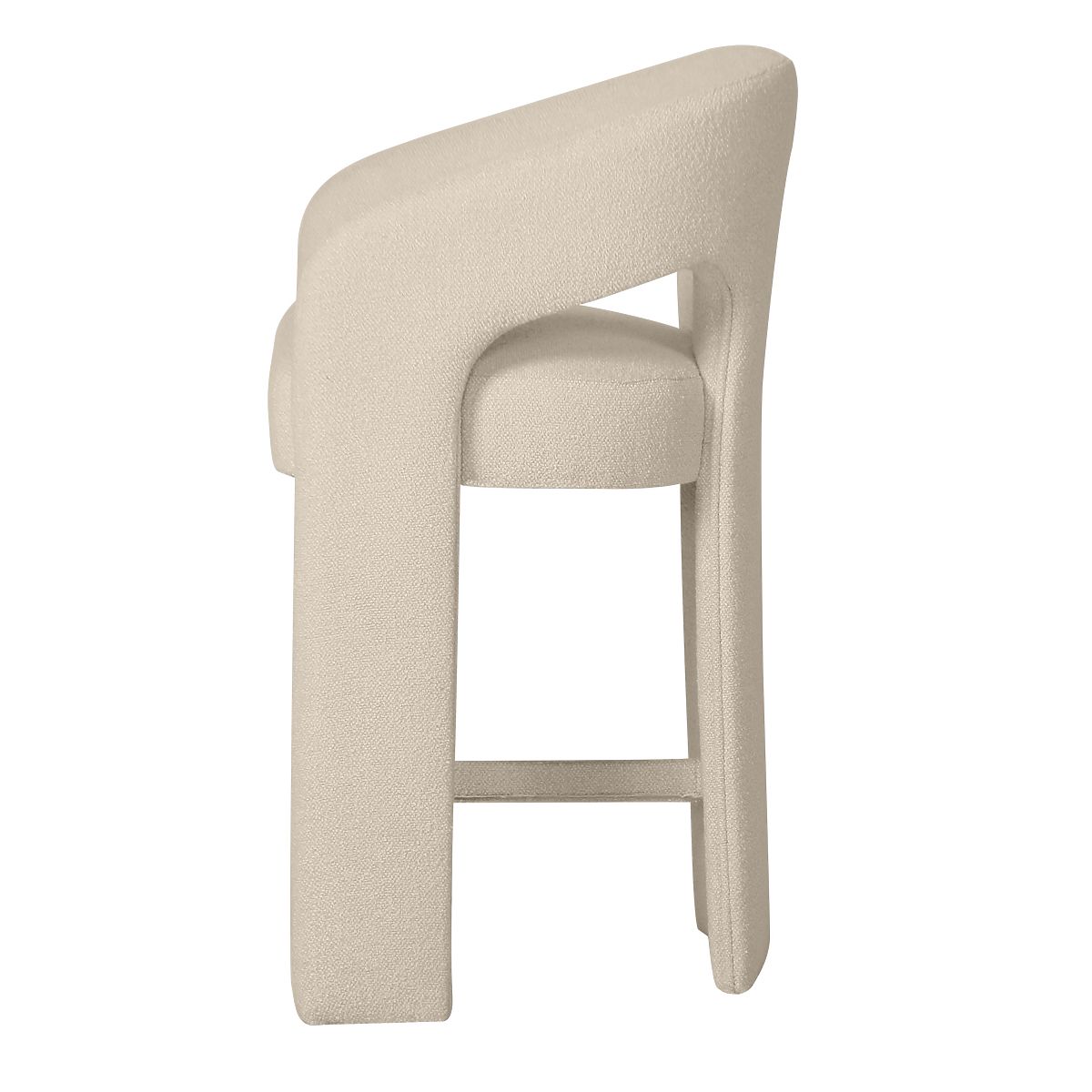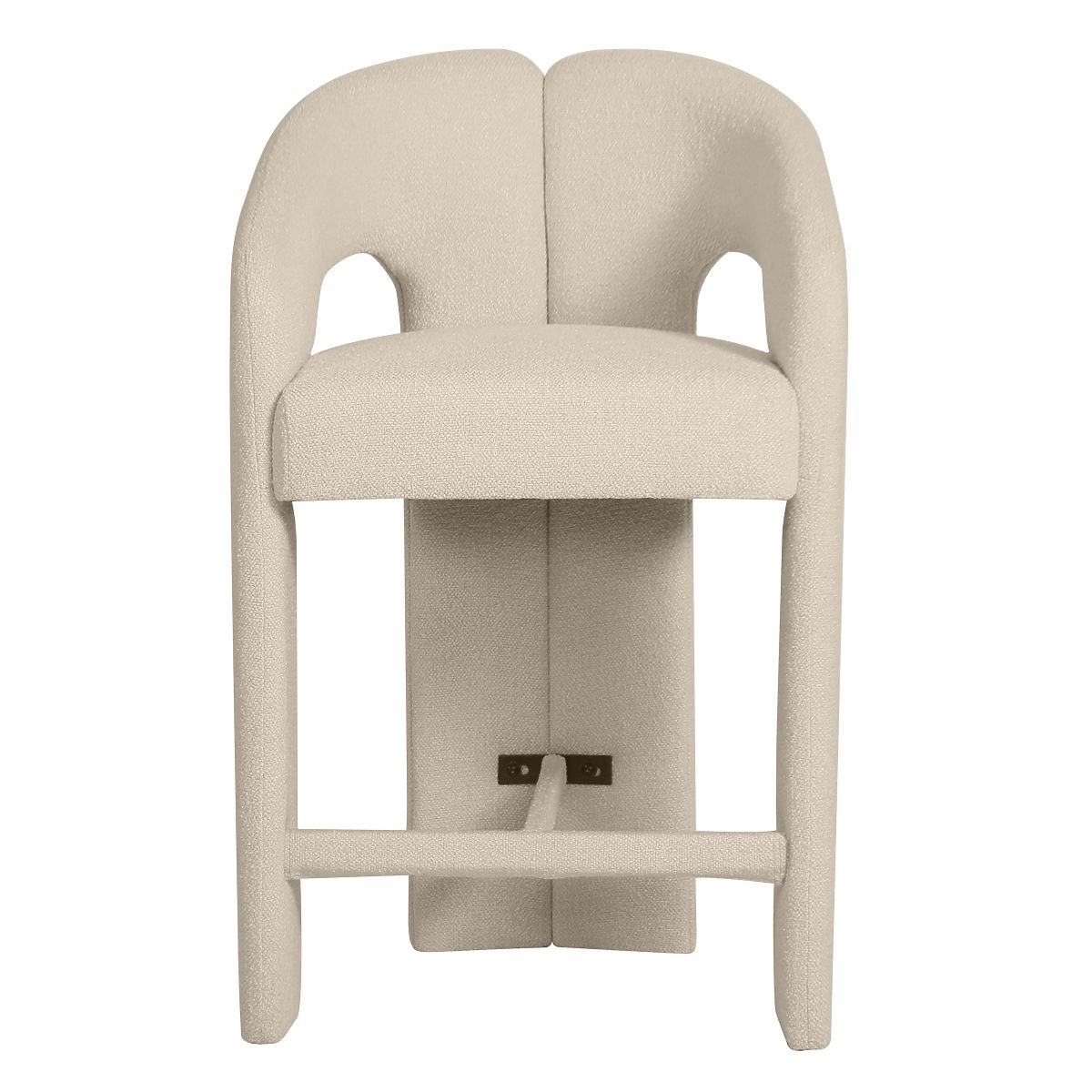 Moderner Barhocker mit beigem Stoff und abgerundeten Formen. .. mehr