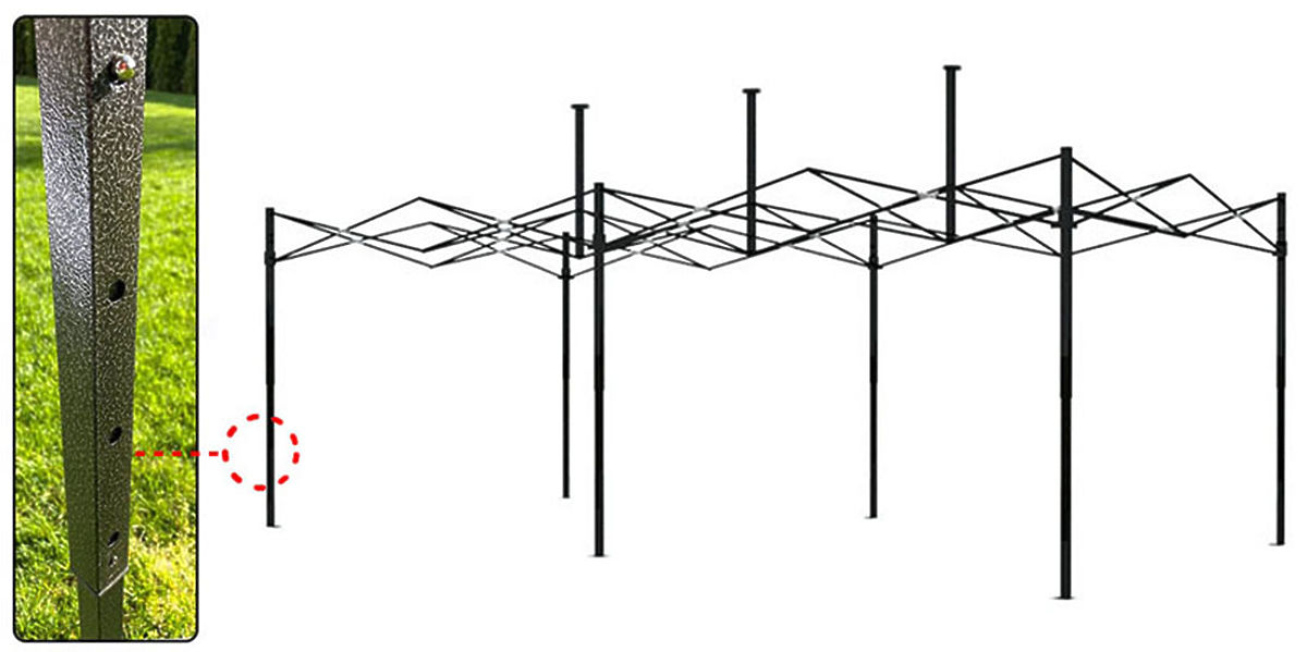 Die Höhe des Pavillons kann dank der 4-stufigen Einstellung (280, 290, 300 und 310 cm) an Ihre Bedürfnisse angepasst werden. Das bedeutet, dass Sie ihn leicht auf die bevorzugte Höhe einstellen können. Der Aufbau, Abbau und die Einstellung des faltbaren Pavillons sind dank des Rastsystems sehr einfach. Drücken Sie einfach einen Knopf, um die Konstruktion abzusenken. Wenn Sie den Pavillon erhöhen möchten, führen Sie die gleiche Aktion aus und heben gleichzeitig das bewegliche Element an. Dank dieser innovativen Lösung ist die Anpassung des Pavillons an Ihre Bedürfnisse schnell und bequem. Unabhängig von der Situation können Sie die Höhe des Pavillons leicht ändern, um optimale Bedingungen und Komfort bei der Nutzung zu gewährleisten.