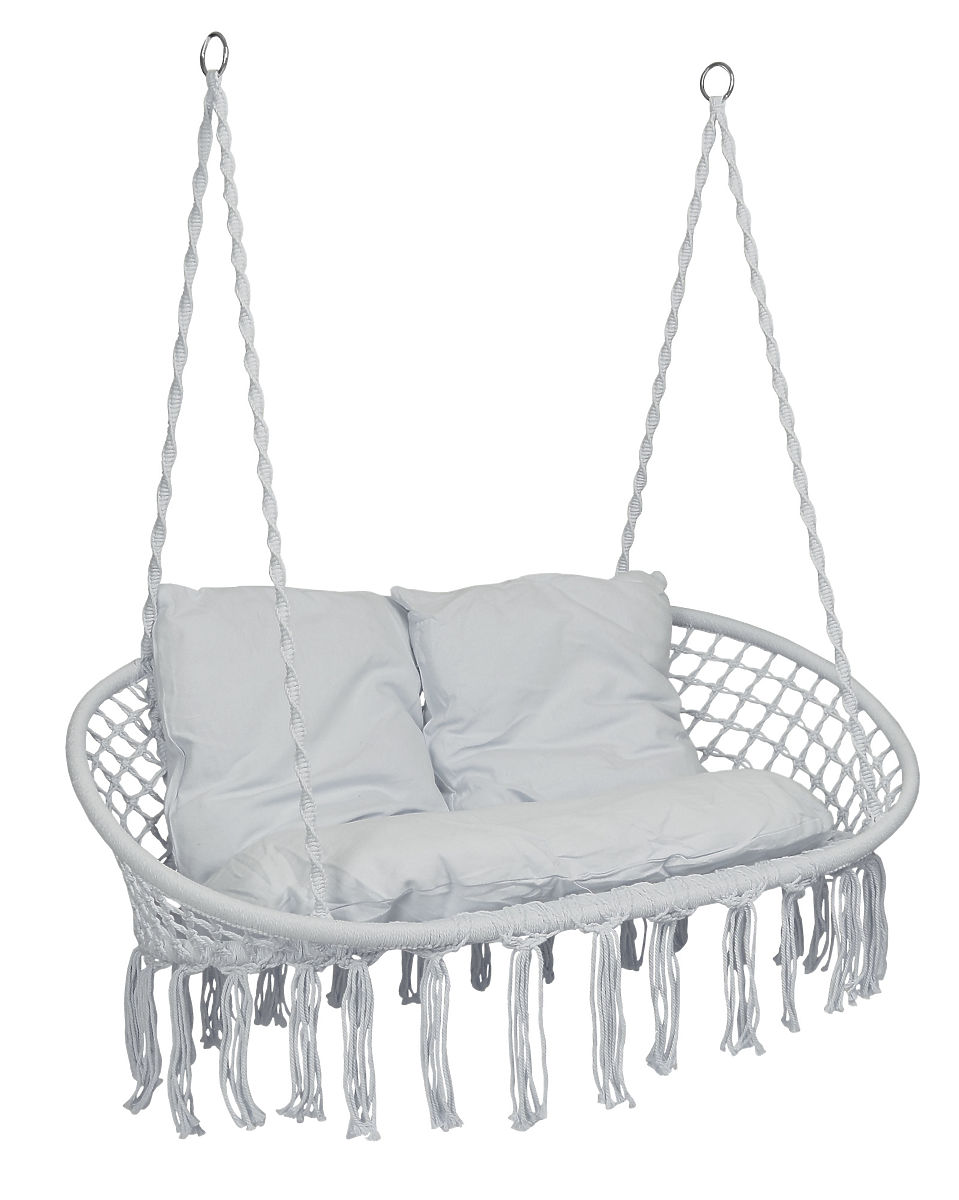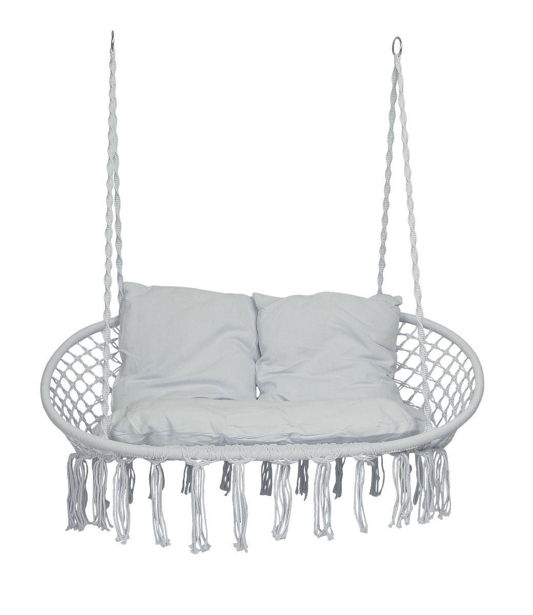 Die Gartenschaukel Lagos ist der neueste Trend im Innendesign. Perfekt zum Entspannen zu zweit, hat sie eine Tragfähigkeit von bis zu 300 kg. Der Stahlrahmen ist mit wunderschönen geflochtenen Mustern im Boho-Stil überzogen. Die Seile, die den bequemen Sitz halten, sind mit Metallringen versehen, was die ein- oder zweipunktige Montage der Schaukel erheblich erleichtert. Die weichen Kissen im Set schaffen eine angenehme Komposition und erhöhen den Nutzungskomfort erheblich.
