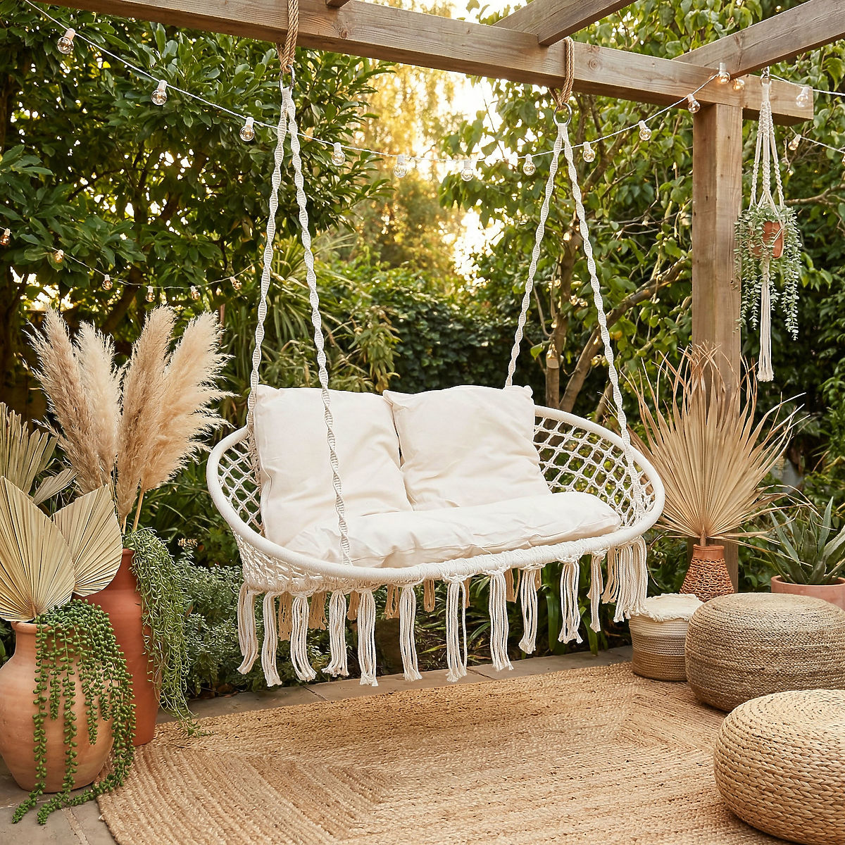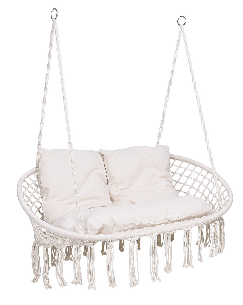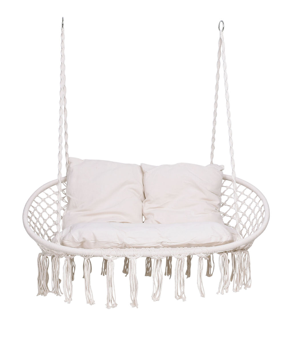 Die Gartenschaukel Lagos ist der neueste Trend im Innendesign. Ideal für die Entspannung zu zweit, mit einer Tragfähigkeit von bis zu 300 kg. Der Stahlrahmen ist mit schönen geflochtenen Mustern im Boho-Stil überzogen. Die Seile, die den bequemen Sitz halten, enden in Metallringen, was die ein- oder zweipunktige Montage der Schaukel erheblich erleichtert. Die weichen Kissen im Set schaffen eine ansprechende Komposition und erhöhen den Nutzungskomfort erheblich.