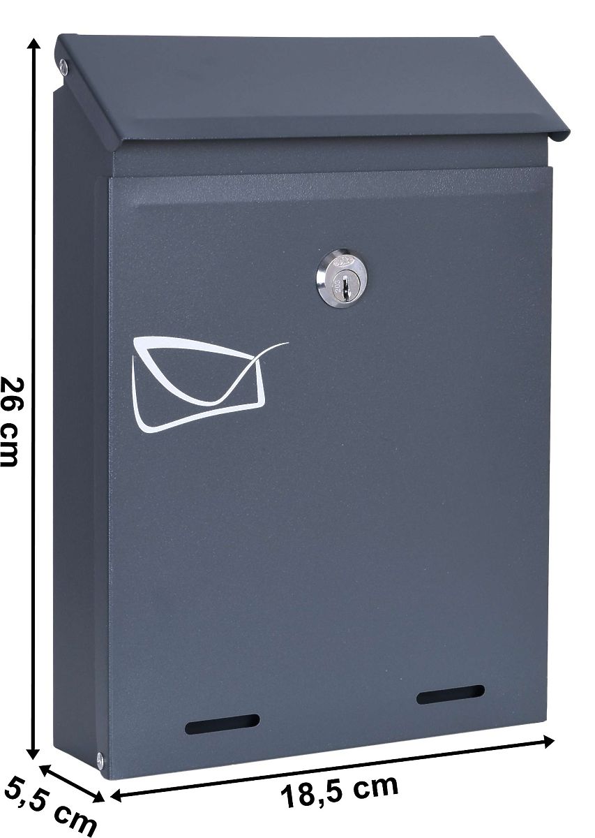 Moderner und funktionaler Briefkasten Odvin Anthrazit, entworfen mit Blick auf Langlebigkeit und Eleganz. Kompakte Abmessungen von 26 x 18,5 x 5,5 cm und ein Briefeinwurf von 18 x 2 cm sind ideal für kleinere Räume. Hergestellt aus verzinktem Stahl mit Pulverbeschichtung, wetterfest, geeignet für die Montage im Freien und Innenbereich. Sicher dank Schloss mit Schlüssel – Set enthält 2 Schlüssel und Montagematerial. Solidität und Stil in einem!