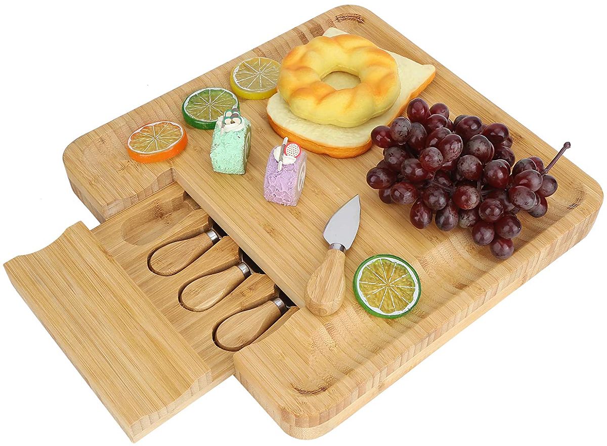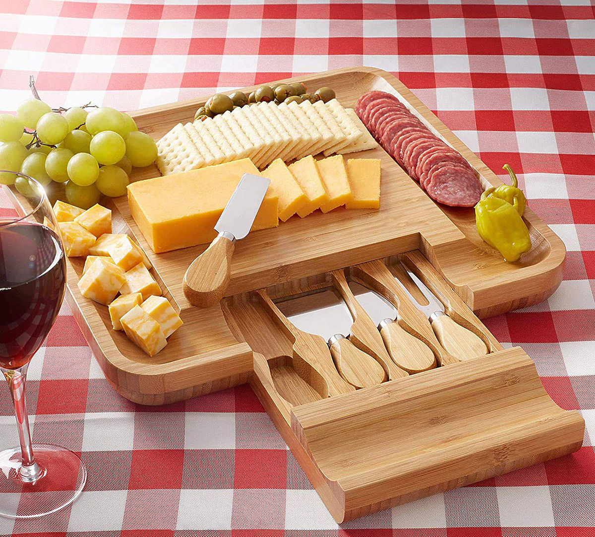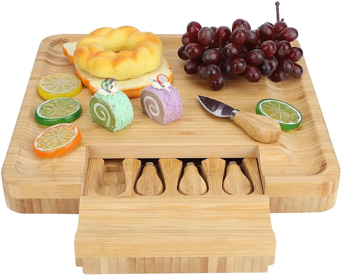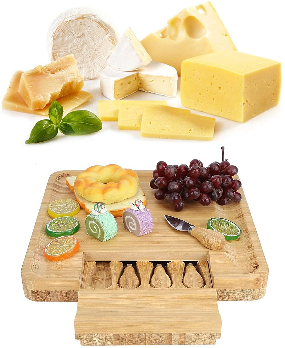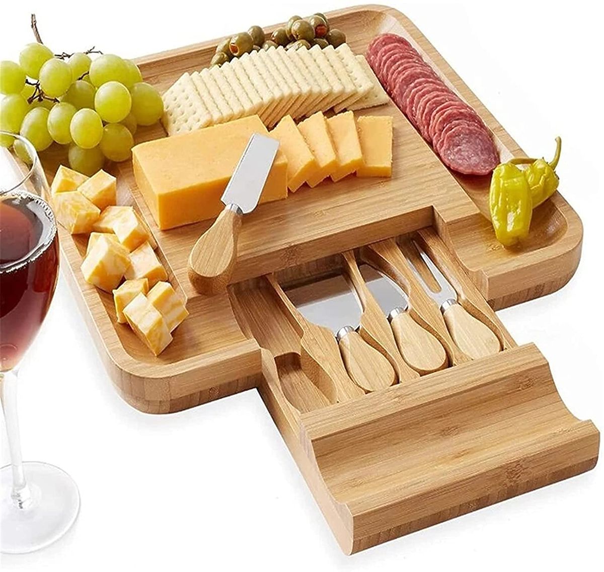 Hergestellt aus 100% hochwertigem Bambusholz. Eine großartige Geschenkidee für Käseliebhaber und nicht nur für sie. Das Brett ist mit einer Schublade ausgestattet, die ein Set aus Edelstahlmessern enthält. Rillen an den Rändern ermöglichen eine effektvolle Anordnung von Snacks und Beilagen. Zusätzliches Zubehör erleichtert das Servieren und Schneiden von Snacks und sorgt für Ordnung auf dem Tisch. Das Brett eignet sich hervorragend für jede Party oder Zusammenkunft mit Freunden. Es wird ein tolles Geschenk-Accessoire sein.