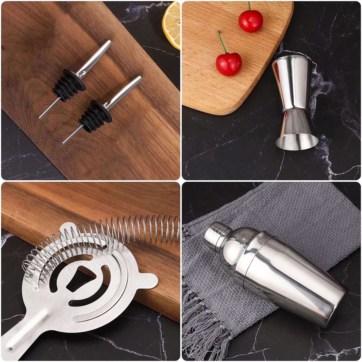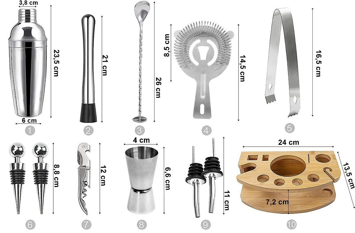 Barkeeper-Set für Getränke 12 Teile CHESTER Verwendung: Küche / Veranstaltungsorganisation | Farben: verchromt Das Barkeeper-Set Chester, bestehend aus 12 Teilen, ist ein ideales Geschenk und auch ein Muss für jeden Cocktail-Liebhaber. Es ist komplett aus hochwertigem Edelstahl gefertigt, wodurch der Geschmack der Getränke nicht verändert wird. Das Set enthält bis zu 12 Teile: 11 Edelstahl-Zubehörteile und einen Bambusständer. Produkteigenschaften hochwertiger Edelstahl 304 Set enthält bis zu 12 Teile verändert den Geschmack der Getränke nicht hervorragende Geschenkidee spülmaschinengeeignet Set-Teile 1x Shaker 750ml 1x Eiszange 1x Doppelmessbecher 15/30ml "Jigger" 1x Barkeeper-Stößel "Muddler" 1x Lange Barkeeper-Löffel 1x Korkenzieher 1x Sieb 2x Ausgießer 2x Verschluss 1x Bambusständer Weitere Informationen Die dargestellten Farben sind als Richtwerte zu betrachten - sie können aufgrund unterschiedlicher Monitoreinstellungen und des Fotobearbeitungsprozesses von den tatsächlichen abweichen. Die tatsächlichen Abmessungen können von den oben angegebenen abweichen. Die Fehlertoleranz kann +/- 5% betragen. Marke: Gockowiak EAN-Code: 323304MG Farbe: verchromt Anzahl der Teile im Set: 12 Material: Edelstahl Verwendung: herstellen hervorragender Getränke Spülmaschinengeeignet: ja