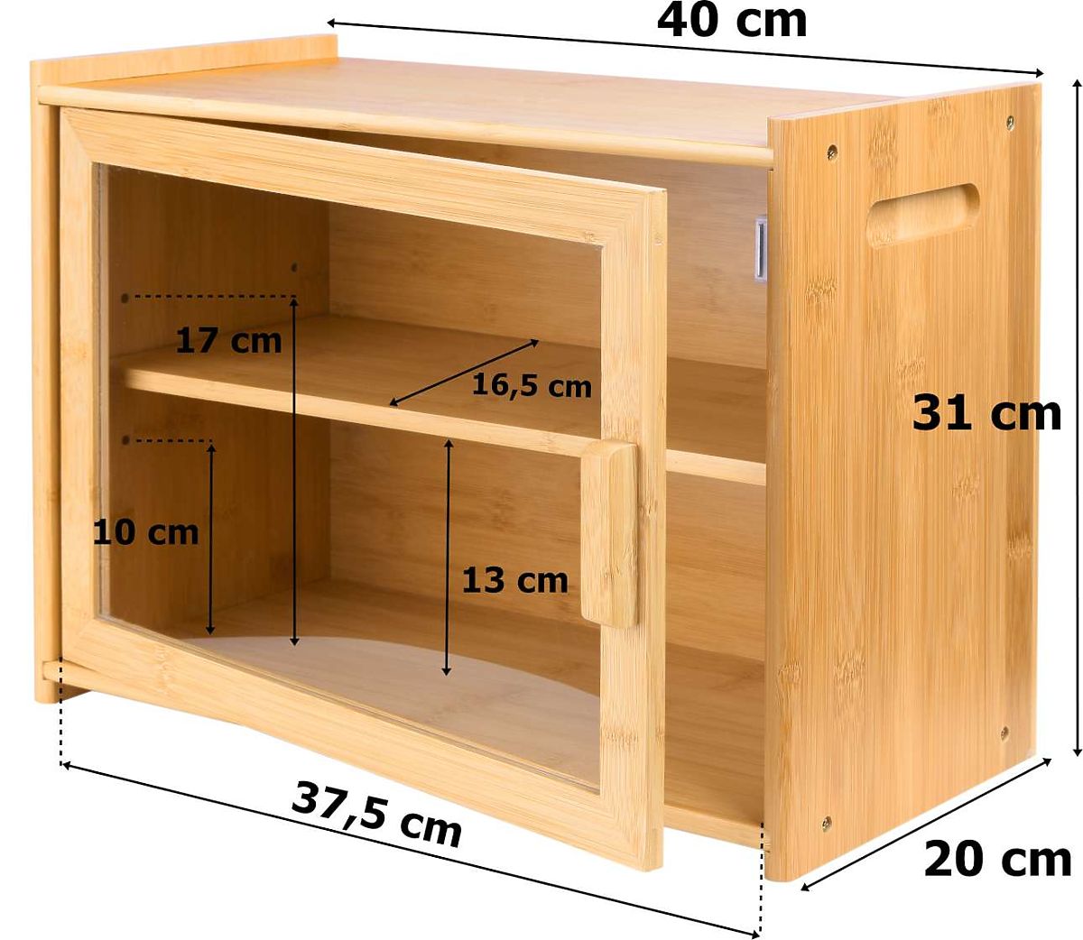 Bambus Brotkasten Pierre, Brotdose Verwendung: Büro, Badezimmer | Farben: natur Pierre ist ein zweistufiger Bambus Brotkasten aus 100% Bambusholz. Das transparente Plexiglasfenster ermöglicht eine schnelle Identifizierung des Brotes. Der Brotkasten verfügt über ausgeschnittene Griffe für einfaches Tragen. Die Höhe des inneren Regals kann nach Bedarf angepasst werden. Das Regal kann herausgenommen und nach dem Herausnehmen als Schneidebrett verwendet werden. Bei der Herstellung des Brotkastens wurden Materialien von höchster Qualität mit Augenmerk auf jedes Detail verwendet. Der Brotkasten ist ästhetisch fertiggestellt, mit glatten und abgerundeten Kanten. Produkteigenschaften Material: Holz, Kunststoff, Metall Holzart: 100% Bambusholz Schlossart: magnetisch Oberfläche: glatt und lackiert Gewicht mit Verpackung: 3,5 kg Farbe: natur ACHTUNG - PRODUKT ZUR SELBSTMONTAGE. Produktabmessungen Höhe: 31 cm Breite: 40 cm Tiefe: 20 cm Weitere Informationen Die angegebenen Farben sind Richtwerte - sie können aufgrund unterschiedlicher Monitoreinstellungen und des Fotobearbeitungsprozesses von den tatsächlichen abweichen. Die tatsächlichen Abmessungen können von den angegebenen abweichen. Die Fehlertoleranz kann +/- 5% betragen. Marke: Gockowiak EAN-Code: 325414MG Farbe: Bambus Höhe: 31 cm Breite: 40 cm Tiefe: 20 cm Material: Bambus