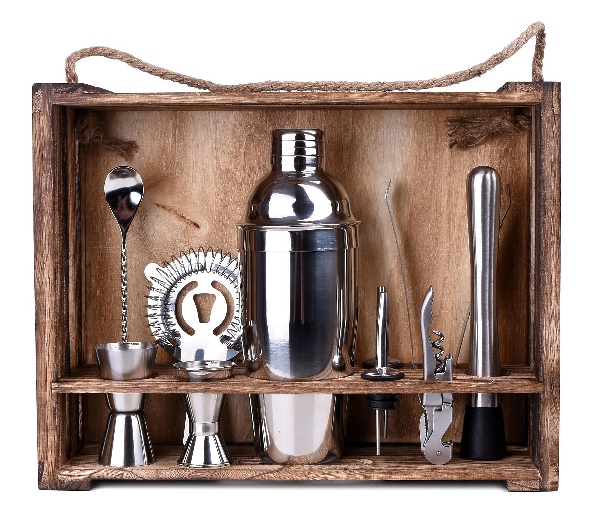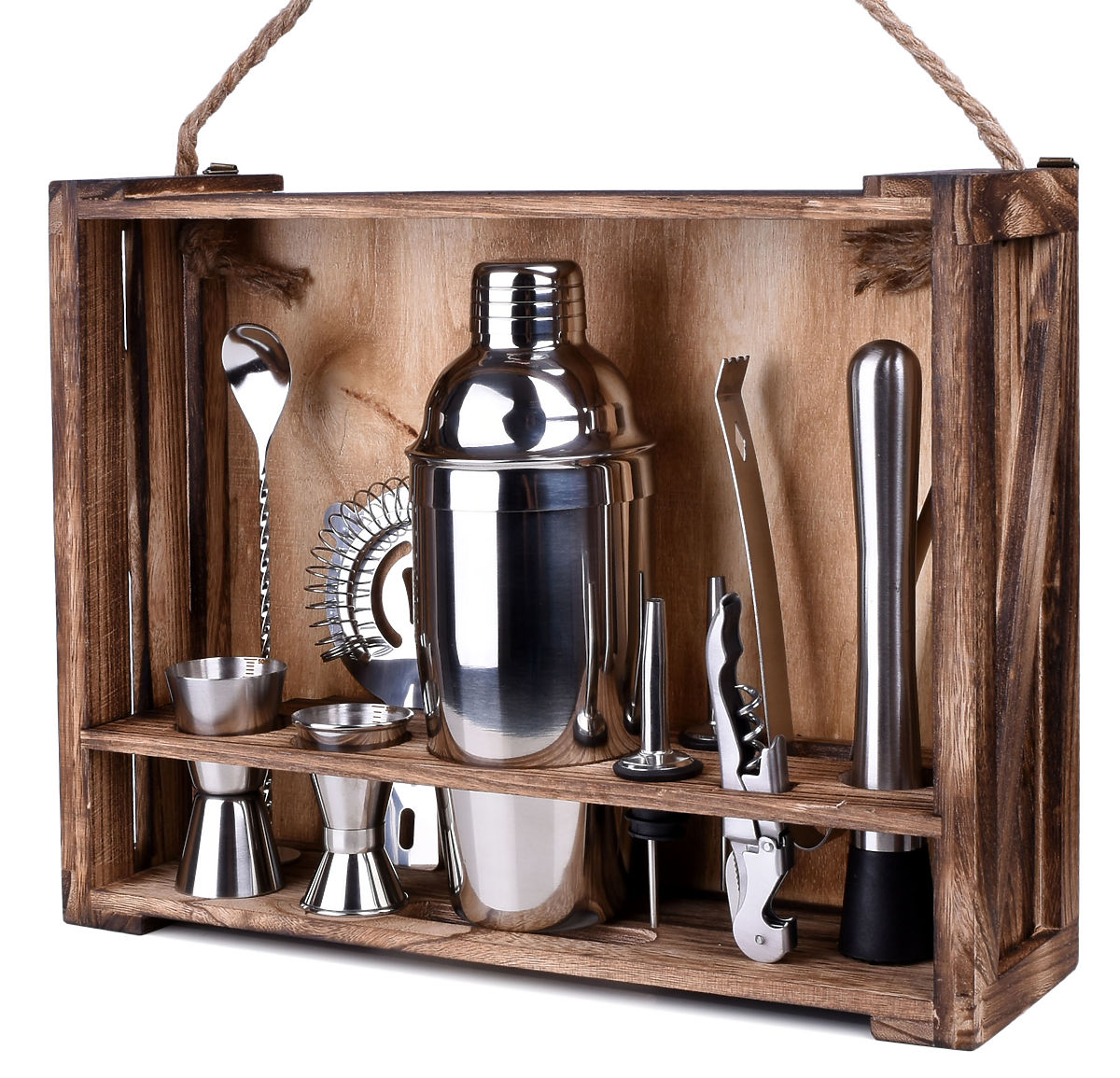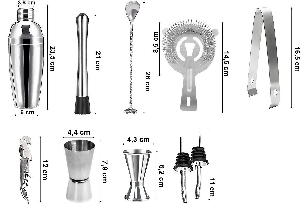 Veranstalten Sie eine Party und möchten Ihre Gäste überraschen? Das Barkeeper-Set hilft Ihnen, die Stimmung aufzulockern und originelle, interessante Drinks zuzubereiten. Jedes Element des Sets besteht aus hochwertigem Edelstahl, wodurch der Geschmack der Getränke nicht verändert wird. Das Set enthält bis zu 11 Teile: 10 Edelstahlzubehörteile und einen Ständer aus karbonisiertem Kiefernholz.