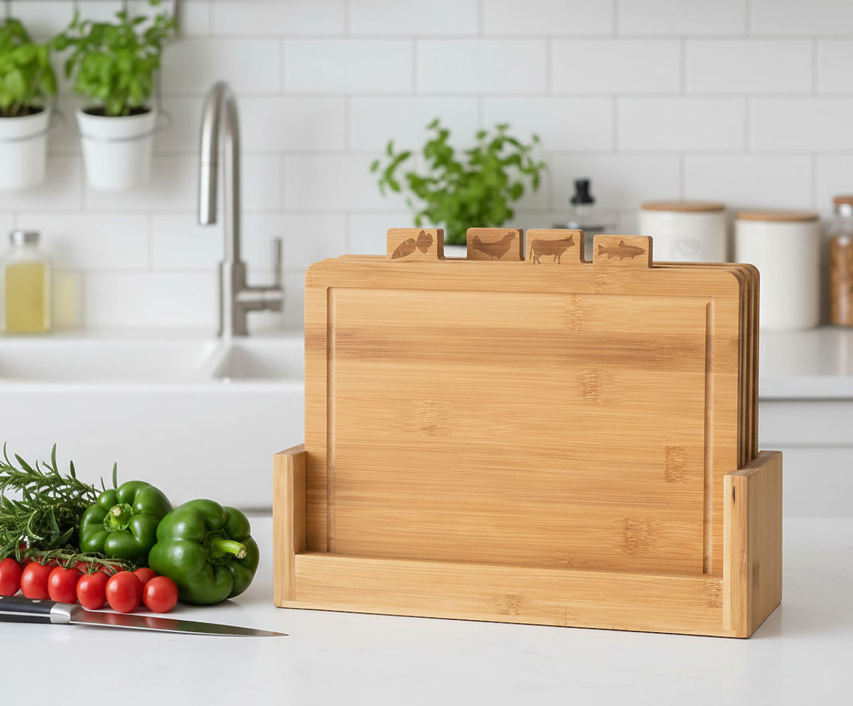 Bambus-Schneidebrett Dori Set 4 Stück Bestimmung: Küche | Farbe: natur Das Bambusbrett-Set Dorri ist die perfekte Wahl für alle, die Wert auf Hygiene und Praktikabilität in der Küche legen. Jedes Brett wurde speziell für die Zubereitung einer bestimmten Art von Lebensmitteln entwickelt, was eine vollständige Trennung von Geschmäckern und Aromen gewährleistet und das Risiko von Kreuzkontaminationen minimiert. Dank der auf den Brettern angebrachten Markierungen lassen sie sich leicht erkennen und entsprechend ihrer Bestimmung verwenden. Das Set enthält einen Ständer aus demselben langlebigen Bambus wie die Bretter, was eine einfache Aufbewahrung und schnellen Zugriff ermöglicht. Bambusholz ist ein ökologisches und gesundheitlich unbedenkliches Material, das eine ideale Lösung für Menschen darstellt, die natürliche Produkte schätzen. Wählen Sie das Bambusbrett-Set Dorri und sorgen Sie für Hygiene und Praktikabilität in Ihrer Küche! Spezifikation Höchste Materialqualität Elegantes, praktisches Set Ästhetische und solide Verarbeitung Bretter auf einem ästhetischen, bambusfarbenen Ständer Bretter aus natürlichem Bambusholz Jedes Brett mit einer Grafik zur Bestimmung gekennzeichnet Hygienische Zubereitung von Speisen Absorbieren keine Gerüche Trocknen schnell Gesundheitlich unbedenklich Das Set nimmt wenig Platz ein Eine interessante Geschenkidee Abmessungen Abmessungen des Ständers mit Brettern B 29,5 cm x H 24 cm x T 11 cm Abmessungen des Brettes B 28 cm x H 20 cm/22 cm (mit Bestimmungssymbol) x D 0,8 cm Spezifikation Material: Bambusholz Bestimmung der Bretter: Gemüse, Geflügel, Fleisch, Fisch Farbe des Ständers: natürlicher Bambus Gewicht: 1,65 kg Zusätzliche Informationen Die dargestellten Farben sind als Richtwerte zu betrachten - sie können aufgrund unterschiedlicher Monitoreinstellungen und Bildbearbeitungsprozesse von den tatsächlichen abweichen. Die tatsächlichen Abmessungen können von den oben angegebenen abweichen. Die Toleranz kann +/- 5% betragen. Marke: Gockowiak EAN-Code: 5902340328286 Farbe: natur Brettbreite: 28 cm Brettlänge: 20 cm Material des Brettes: natürlicher Bambus Material des Ständers: natürlicher Bambus Bestimmung: Küche, Lebensmittel schneiden Im Set enthalten: 4 Bretter und ein Bambuskorb/-ständer