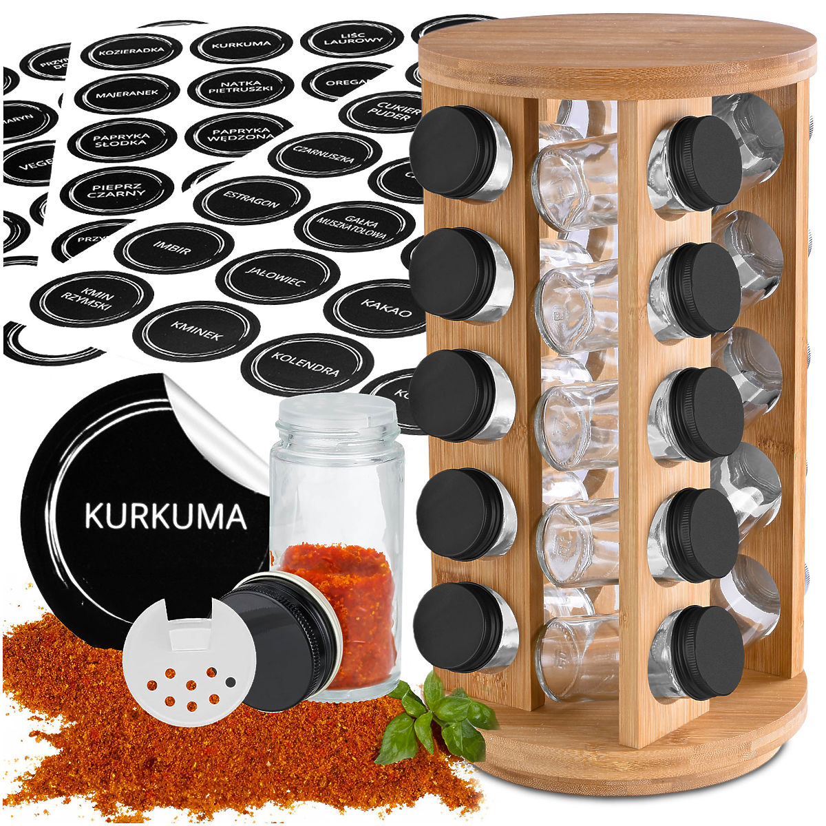 Der Gewürzständer enthält insgesamt 72 Aufkleber zur Beschriftung der Behälter. Davon sind 60 Aufkleber bereits beschriftet, was eine schnelle Organisation und Identifizierung der beliebtesten Gewürze erleichtert. Die verbleibenden 12 Aufkleber sind leer, was eine individuelle Ergänzung und Personalisierung des Sets nach Ihren Bedürfnissen ermöglicht.