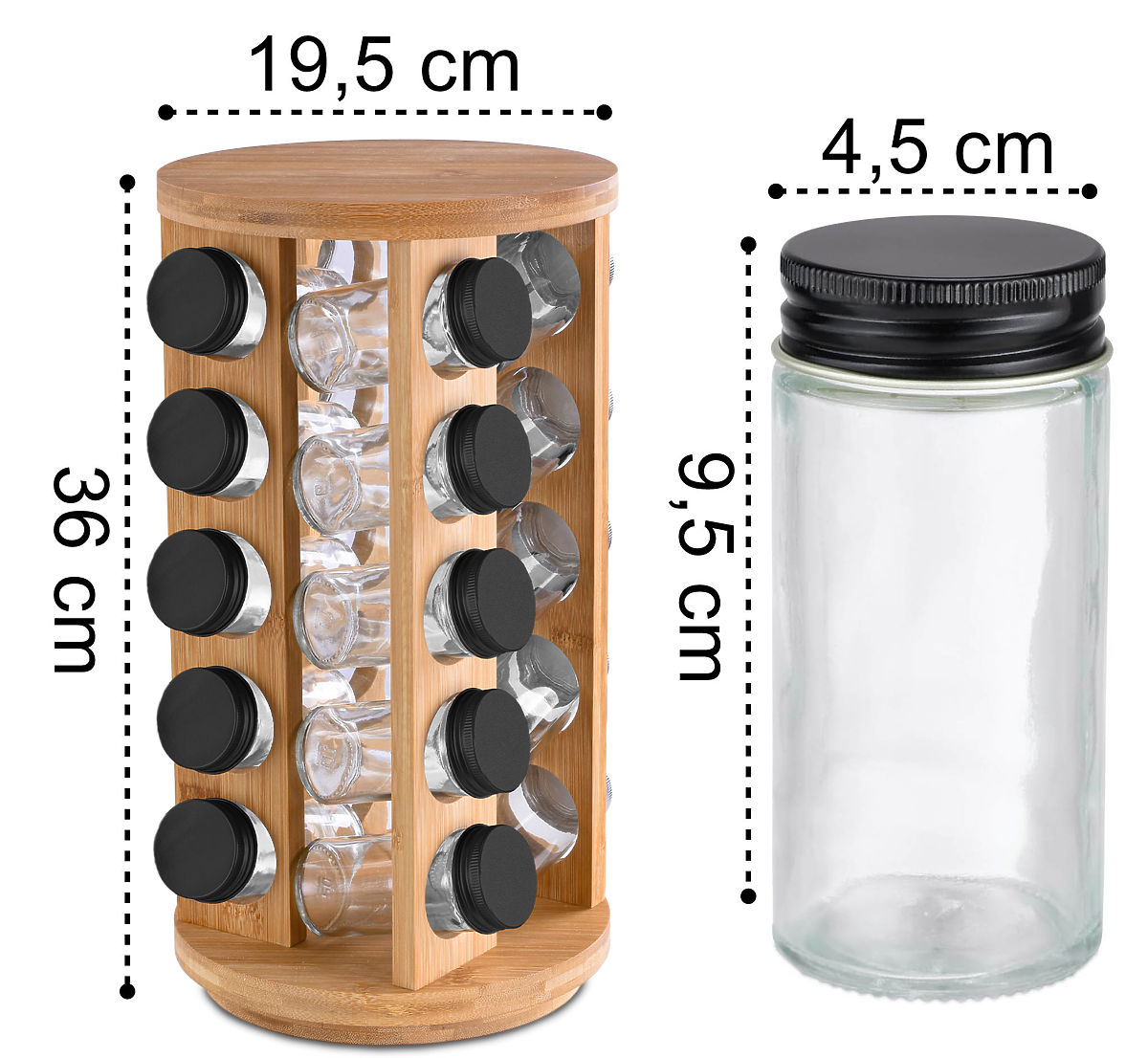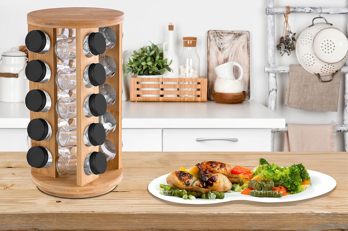 Entdecken Sie den Gewürzständer Rotor, ein einzigartiges Produkt, das Ihre Küche mit einer neuen Dimension der Organisation und Kochleichtigkeit bereichert. Hergestellt aus strapazierfähigem Bambusholz, präsentiert sich der Ständer nicht nur stilvoll, sondern verleiht dem Raum auch eine warme Atmosphäre. Dank der Fähigkeit, sich um volle 360 Grad zu drehen, können Sie schnell das benötigte Gewürz finden, ohne Zeit mit dem Durchsuchen von Regalen zu verlieren. Der Ständer ist mit 20 Glasbehältern ausgestattet, die nicht nur eine einfache Lagerung ermöglichen, sondern auch helfen, Ordnung in Ihrer Küche zu halten. Gewürze sind immer griffbereit, um Ihren Gerichten einzigartige Aromen zu verleihen.
