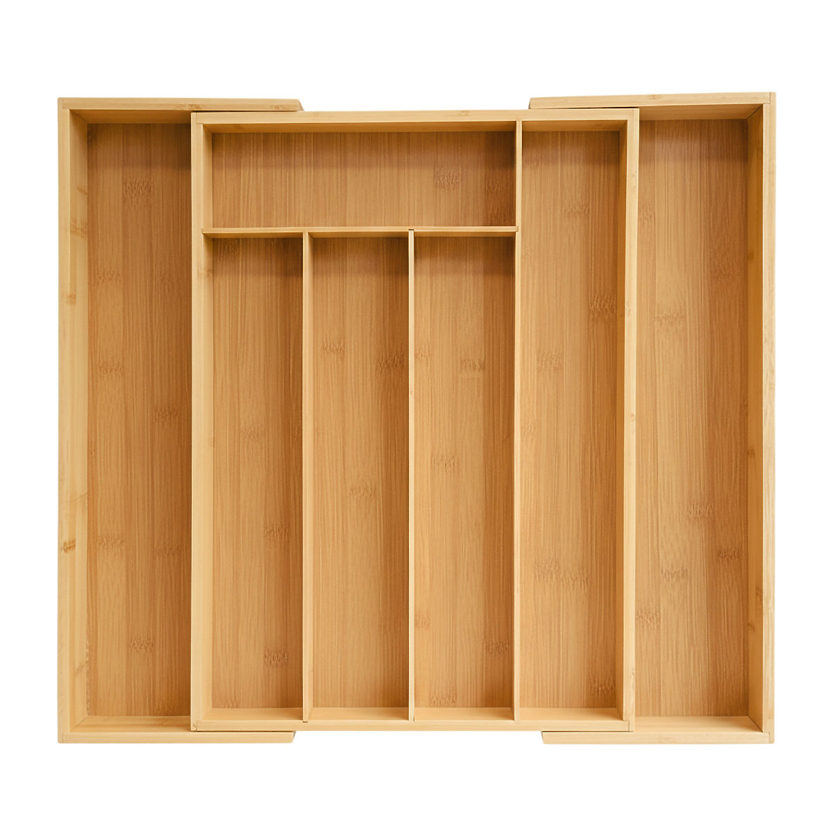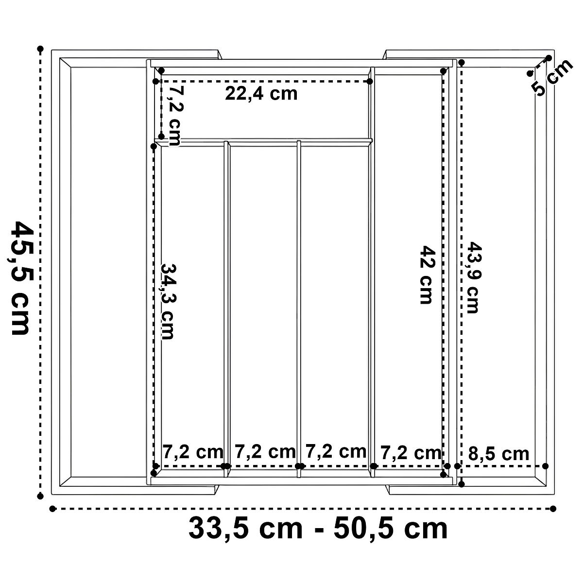Der Organizer Ikar vereint Eleganz und Funktionalität. Hergestellt aus natürlichem Bambusholz, besticht er durch seinen warmen Farbton und die feine Textur, die dem Interieur eine gemütliche Note verleiht. Dank der einstellbaren Breite von 33,5 bis 50,5 cm lässt er sich leicht an verschiedene Schubladengrößen anpassen. Sieben praktische Fächer ermöglichen es, Besteck und kleine Accessoires perfekt zu ordnen. Das universelle Design sorgt dafür, dass der Organizer nicht nur in der Küche, sondern auch im Büro oder Badezimmer seinen Platz findet – überall dort, wo Sie Harmonie und Funktionalität in eleganter Ausführung schätzen.