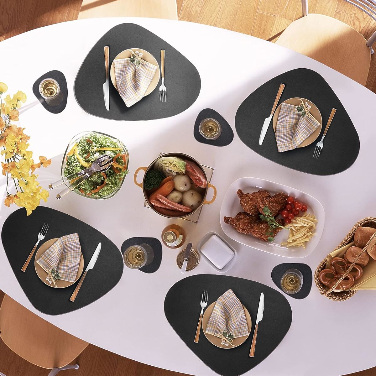 Vorteile der Verwendung von Unterlagen ✅ Reichhaltiges Set mit bis zu 8 Unterlagen ermöglicht es, jeden Innenraum zu sichern und zu dekorieren! ✅ Schmutzresistenz: Unterlagen aus dem Material sind leicht zu reinigen und fleckenresistent, was ihre Pflege äußerst einfach macht. ✅ Wasserresistenz: Unterlagen aus dem Material lassen keine Feuchtigkeit durch, wodurch die Tischoberfläche vor Flecken und Schäden durch Feuchtigkeit geschützt wird. ✅ Temperaturbeständigkeit: Das Material, aus dem die Unterlagen hergestellt sind, hält Temperaturen bis zu 100°C stand ✅ Langlebigkeit: Das Material ist strapazierfähig und verschleißfest, was bedeutet, dass die Unterlagen aus dem Material lange dienen und ihr ursprüngliches Aussehen bewahren. ✅ Ästhetik: Unterlagen aus dem Material, insbesondere in schwarzer Farbe, verleihen jedem Tisch Eleganz und Modernität und machen ihn zu einem außergewöhnlichen dekorativen Element im Esszimmer, in der Küche oder im Wohnzimmer. ✅ Vielseitigkeit: Dank ihrer Vielseitigkeit können die Unterlagen aus dem Material sowohl im Alltag als auch bei besonderen Anlässen verwendet werden und verleihen jeder Mahlzeit und jedem Treffen einen außergewöhnlichen Charakter. Ihre schwarze Farbe passt gut zu jedem Interieur.