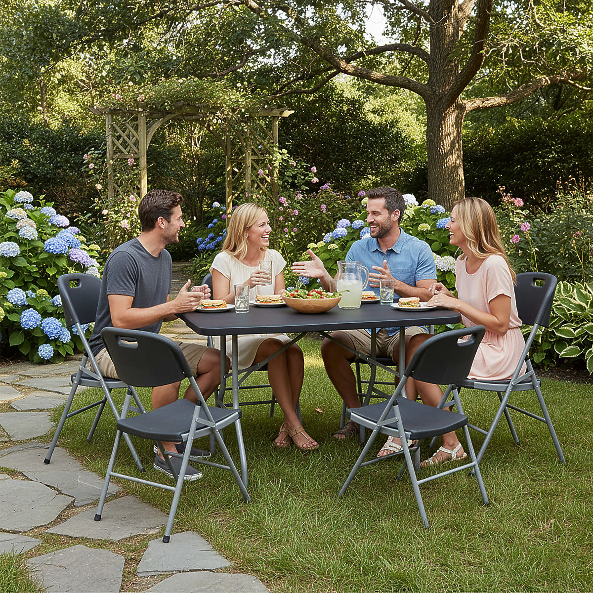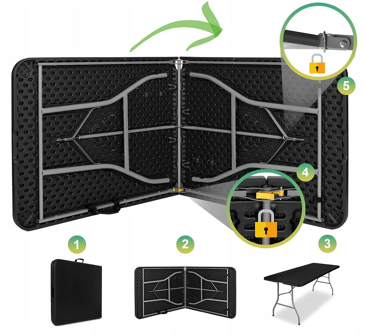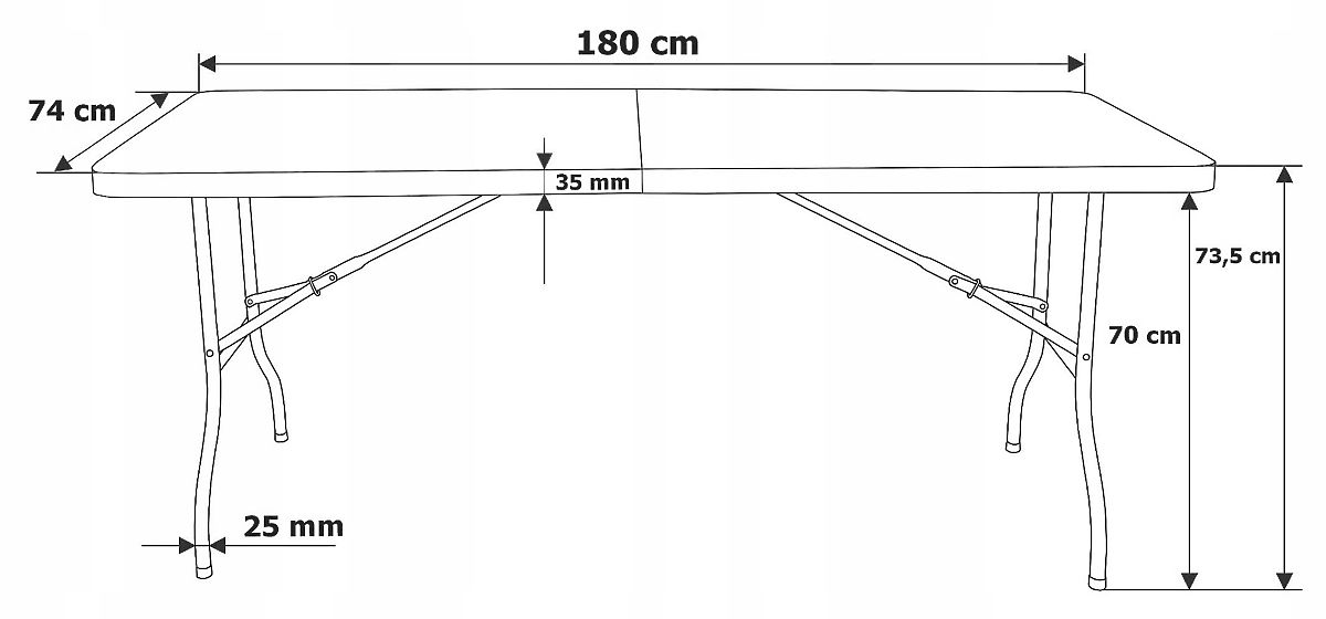 Catering-Set FETA BLACK 180 cm + 6 Stühle BLACK Bestimmung: Außenbereich, Garten, Firmen- und Familienveranstaltungen | Farbe der Sitzfläche/Platte: schwarz ⭐️ Komplettes Set bestehend aus Tisch und 6 Stühlen in Schwarz ⭐️ Bequeme Tragegriffe ⭐️ Tisch 180 cm zusammenklappbar zu einem Koffer ⭐️ Maximale Belastung des Tisches 150 kg ⭐️ Maximale Belastung des Stuhls 120 kg ⭐️ Kauf direkt vom Hersteller ✨Das Set enthält: einen 180 cm langen Catering-Tisch und 6 Catering-Stühle✨ Das Catering-Set, das einen klappbaren Tisch mit einer Länge von 180 cm und 6 klappbaren Stühlen enthält, ist ideal für verschiedene Veranstaltungen. Die Stabilität wird durch eine Konstruktion aus pulverbeschichtetem Stahl gewährleistet, und das strapazierfähige HDPE-Material, aus dem die Platte und die Sitze gefertigt sind, garantiert Widerstandsfähigkeit gegen Beschädigungen. Sowohl der Tisch als auch die Stühle sind leicht transportierbar – der Tisch verfügt über einen praktischen Griff und die Stühle haben eine Öffnung in der Rückenlehne, die den Transport erleichtert. Das gesamte Set ist wetterbeständig und rutschfeste Füße sorgen für Stabilität. ✅ Bequemer Transport ✅ Einfache Lagerung ✅ Verriegelung gegen unbeabsichtigtes Zusammenklappen der Platte ✅ Verriegelung gegen unbeabsichtigtes Zusammenklappen des Rahmens ✅ Rutschfeste Füße Produkteigenschaften Material der Platte und Sitzfläche: HDPE-Polyethylen 100% wasserdicht Material des Rahmens: pulverbeschichteter Stahl Klappbar, bequeme Tragegriffe Rutschfeste Füße Gewichte: Tisch 11 kg, Stuhl 4,55 kg Maximale gleichmäßige Belastung des Tisches: 150 kg Maximale Belastung des Stuhls: 120 kg Abmessungen des Stuhls Gesamthöhe des Stuhls: 85,5 cm Gesamtbreite des Stuhls: 45 cm Gesamttiefe des Stuhls: 51 cm Sitzhöhe: 42 cm Sitzbreite: 40 cm Sitztiefe: 40 cm Rückenlehnenbreite: 45 cm Rückenlehnenhöhe: 24 cm Höhe der Rückenlehne vom Sitz: 46 cm Beinabstand: 48 x 44,5 cm Abmessungen des zusammengeklappten Stuhls: 14x110x45 cm Abmessungen des Tisches Länge: 180 cm Breite: 74 cm Höhe: 73,5 cm (obere Plattenkante), 70 cm (untere Plattenkante) Abmessungen des zusammengeklappten Tisches (Koffer): 74 x 92,5 x 7 cm Plattendicke: 35 mm Rahmenrohrdicke: 25 mm Weitere Informationen Die dargestellten Farben sind als Richtwerte zu betrachten - sie können aufgrund unterschiedlicher Monitoreinstellungen und des Fotoanpassungsprozesses von den tatsächlichen abweichen. Die tatsächlichen Abmessungen können von den oben angegebenen abweichen. Die Fehlertoleranz kann +/- 5% betragen. ❓Q&A (Fragen und Antworten) ❓ ➡️ Wie hoch ist die maximale Belastung des Tisches und der Stühle? Die maximale gleichmäßige Belastung des Tisches beträgt 150 kg und die maximale Belastung des Stuhls 120 kg. ➡️ Sind Tisch und Stühle leicht transportierbar? Ja, Tisch und Stühle haben bequeme Tragegriffe, die den Transport erleichtern. ➡️ Wie sind die Abmessungen von Tisch und Stühlen im zusammengeklappten Zustand? Die Abmessungen des zusammengeklappten Tisches betragen 74 x 92,5 x 7 cm und die der Stühle 14 x 110 x 45 cm. ➡️ Hat der Tisch eine Sicherung gegen unbeabsichtigtes Zusammenklappen? Ja, der Tisch ist mit speziellen Verriegelungen ausgestattet, die sowohl die Platte als auch den Rahmen gegen unbeabsichtigtes Zusammenklappen sichern. ➡️ Benötigt das Möbelstück eine Montage? Nein, Tisch und Stühle sind ohne zusätzliche Montage einsatzbereit – einfach aufklappen. ➡️ Haben Tisch und Stühle Schutzpolster an den Füßen? Ja. Dadurch ist die Nutzung des Sets viel sicherer. Sie sind ideal für Outdoor-Veranstaltungen, im Garten, auf dem Grundstück, beim Camping, Picknick, und die Stühle eignen sich auch hervorragend für Büros, Konferenzen und Firmenveranstaltungen. Marke: eHokery Produktcode: 067361MG EAN-Code: 5905523067361 Farbe der Sitzfläche und Rückenlehne: schwarz Im Set enthalten: Tisch und 6 Stühle Material: Stahl und HDPE Rutschfeste Füße: ja Klappbar: ja