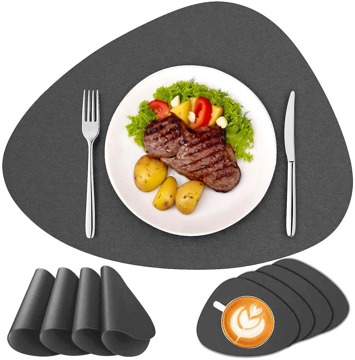 Das Trival Tischset ist ein hochwertiges Set von Tischunterlagen in elegantem Grau, hergestellt aus strapazierfähigem PVC-Material. Dieses Set ist die ideale Lösung, um Ihren Tisch nicht nur vor Flecken und Beschädigungen zu schützen, sondern auch um Ihrem Interieur Eleganz zu verleihen. Das Set enthält 4 große Unterlagen, die sich hervorragend unter Teller eignen und eine stabile und ästhetische Basis für Ihre Speisen bieten. Zusätzlich enthält das Set 4 kleinere Unterlagen, ideal für Tassen und Becher, die die Tischoberfläche vor möglichen Schäden durch heiße Getränke schützen. Das Trival Tischset pflegt nicht nur Ihren Tisch, sondern bereichert auch dessen Aussehen.