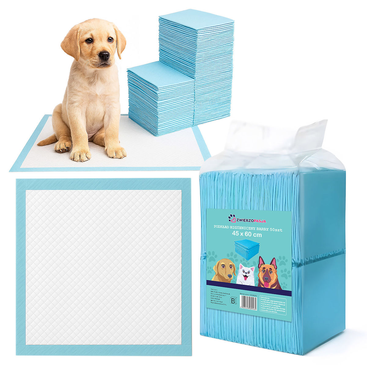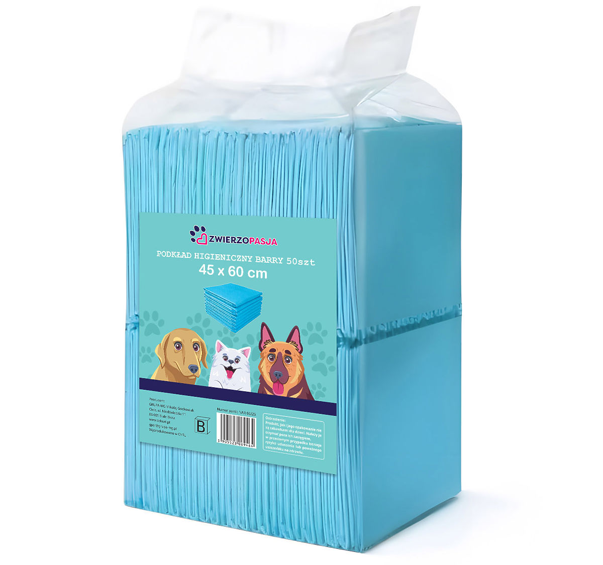 Hygienische Unterlagen BARRY 45x60 50 Stk. Verwendung: Für kleine Tiere | Größe: 45 x 60 cm Die hygienischen Unterlagen Barry sind eine praktische und zuverlässige Unterstützung für jeden Hundebesitzer. Sie erleichtern die Sauberhaltung im Haushalt, fördern die hygienischen Gewohnheiten bei Welpen und schützen effektiv Böden und Schlafplätze vor Verschmutzung. Dank ihnen können Sie und Ihr Haustier jeden Tag mehr Komfort und Ruhe genießen. ☑️ Produktspezifikationen und -abmessungen: Abmessungen: 45 × 60 cm Anzahl der Stücke in einer Packung: 50 Material: Vliesstoff Papier SAP (superabsorbierendes Natriumpolyacrylat) — absorbierende Granulate Flauschige Holzcellulose PE (Polyethylen) Weitere Informationen: Die angegebenen Farben sind indikativ - sie können aufgrund unterschiedlicher Monitoreinstellungen und Fotobearbeitungsprozesse von den tatsächlichen abweichen. Die tatsächlichen Abmessungen können von den oben genannten abweichen. Die Fehlertoleranz kann +/- 5% betragen. Marke: Zwierzopasja EAN-Code: 5905523069464 Farbe: blau, weiß Länge: 45 cm Breite: 60 cm