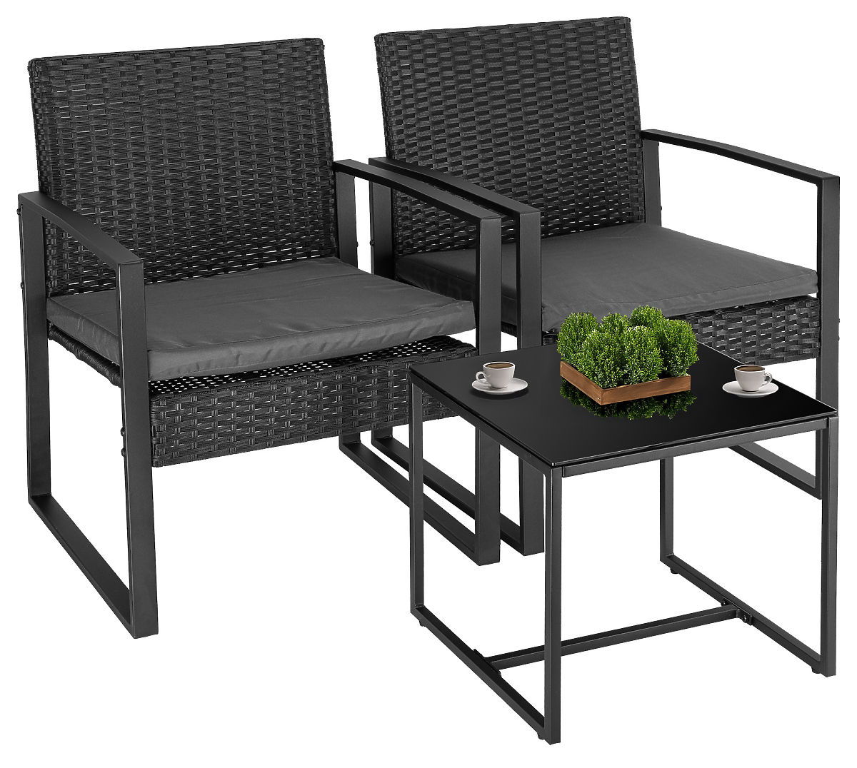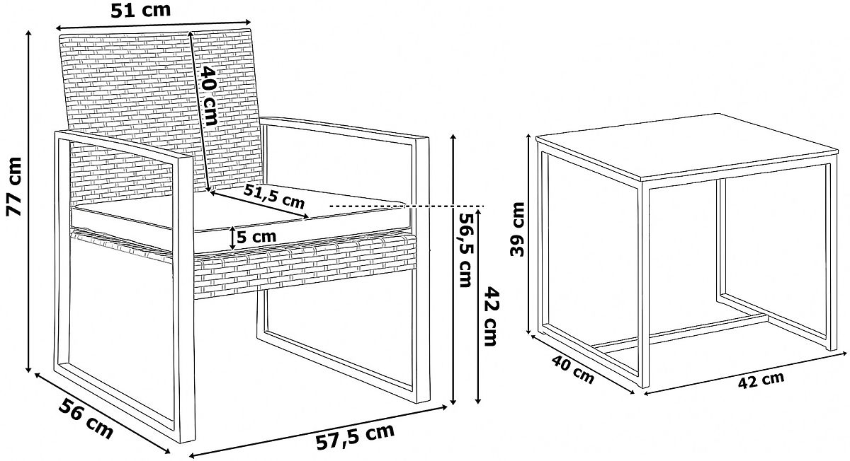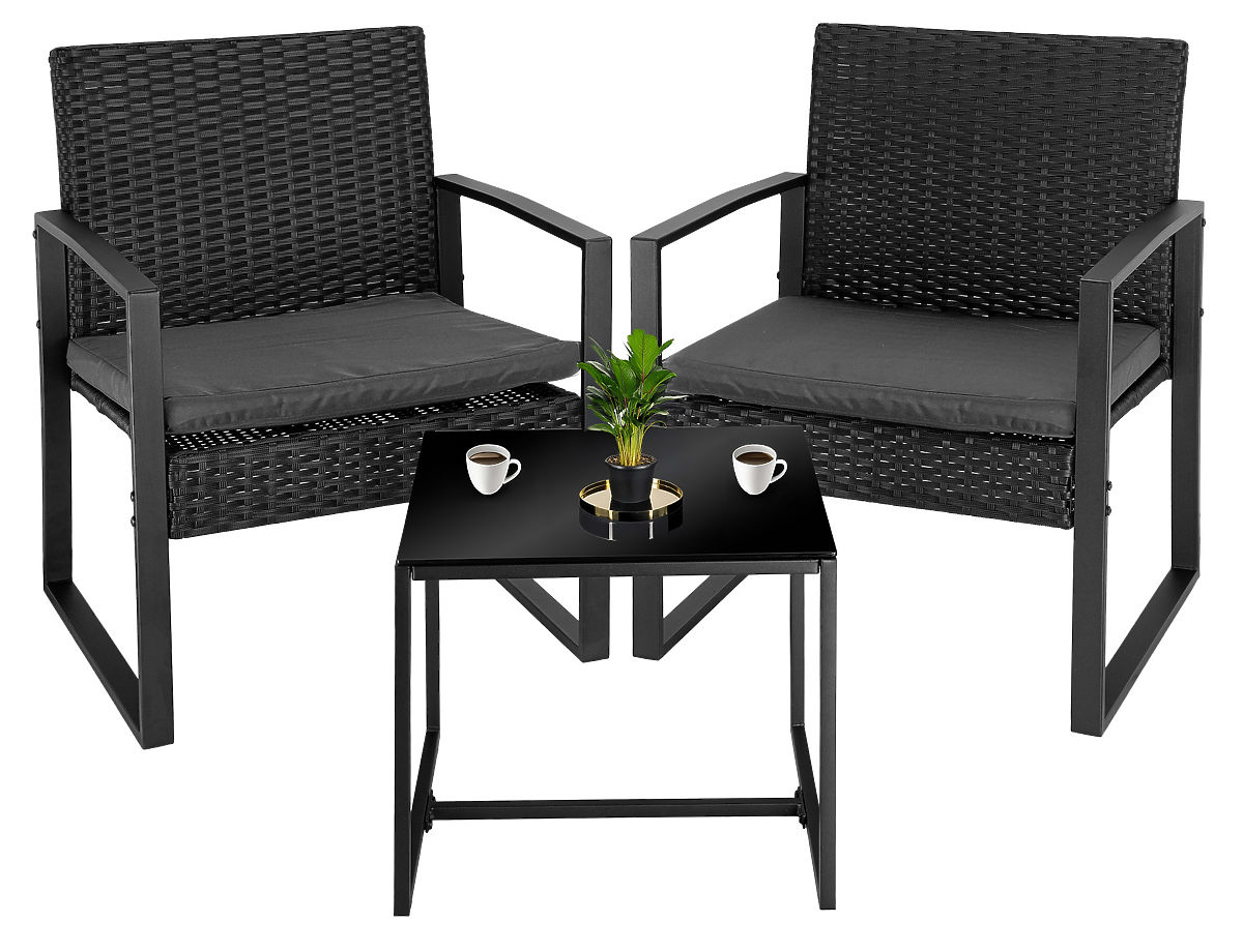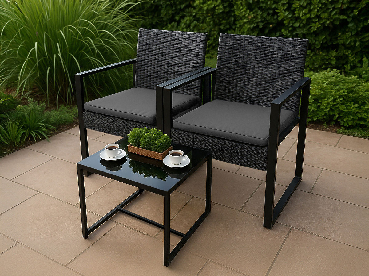 Das kompakte Set aus zwei Stühlen und einem Tisch ermöglicht es, eine gemütliche Kaffee-Ecke zu schaffen, unabhängig von der Größe des Raumes. Das Set ist aus Technorattan und pulverbeschichtetem Stahl gefertigt. Bequeme Kissen sorgen für Komfort auch bei längerem Entspannen. Das Coffi-Set vereint modernes Design mit Praktikabilität – eine Investition in den täglichen Komfort, die sich lohnt.