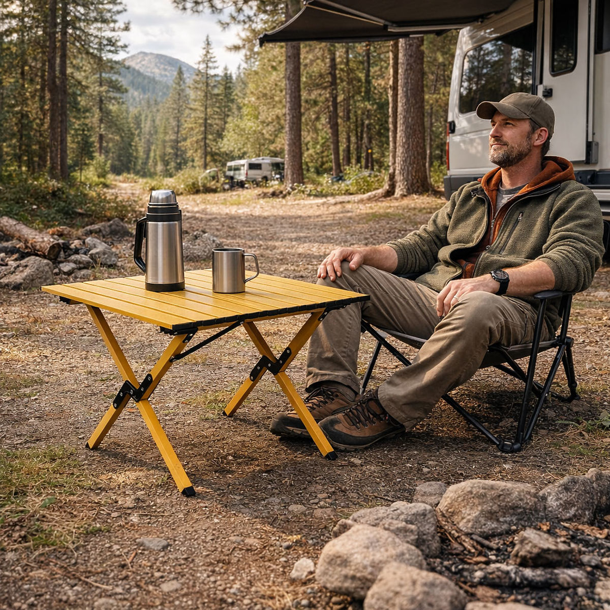 Der Campingtisch von MultiGarden ist eine praktische Lösung, die mit Blick auf Erholung im Freien entwickelt wurde. Er eignet sich hervorragend beim Campen, Zelten, auf Ausflügen, bei Picknicks oder Grillen im Garten und bietet einen bequemen Platz zum Essen, zur Zubereitung von Snacks oder zum Abstellen von Getränken und Campingzubehör. Dank seiner mobilen Konstruktion kann der Tisch leicht mit an den See, in den Garten, in den Wald oder an den Strand genommen werden. Er ist auch eine großartige Ergänzung für die Entspannungszone im Garten oder auf der Terrasse, wenn Sie leichtes und funktionales Mobiliar benötigen, das Sie überall schnell aufstellen können.