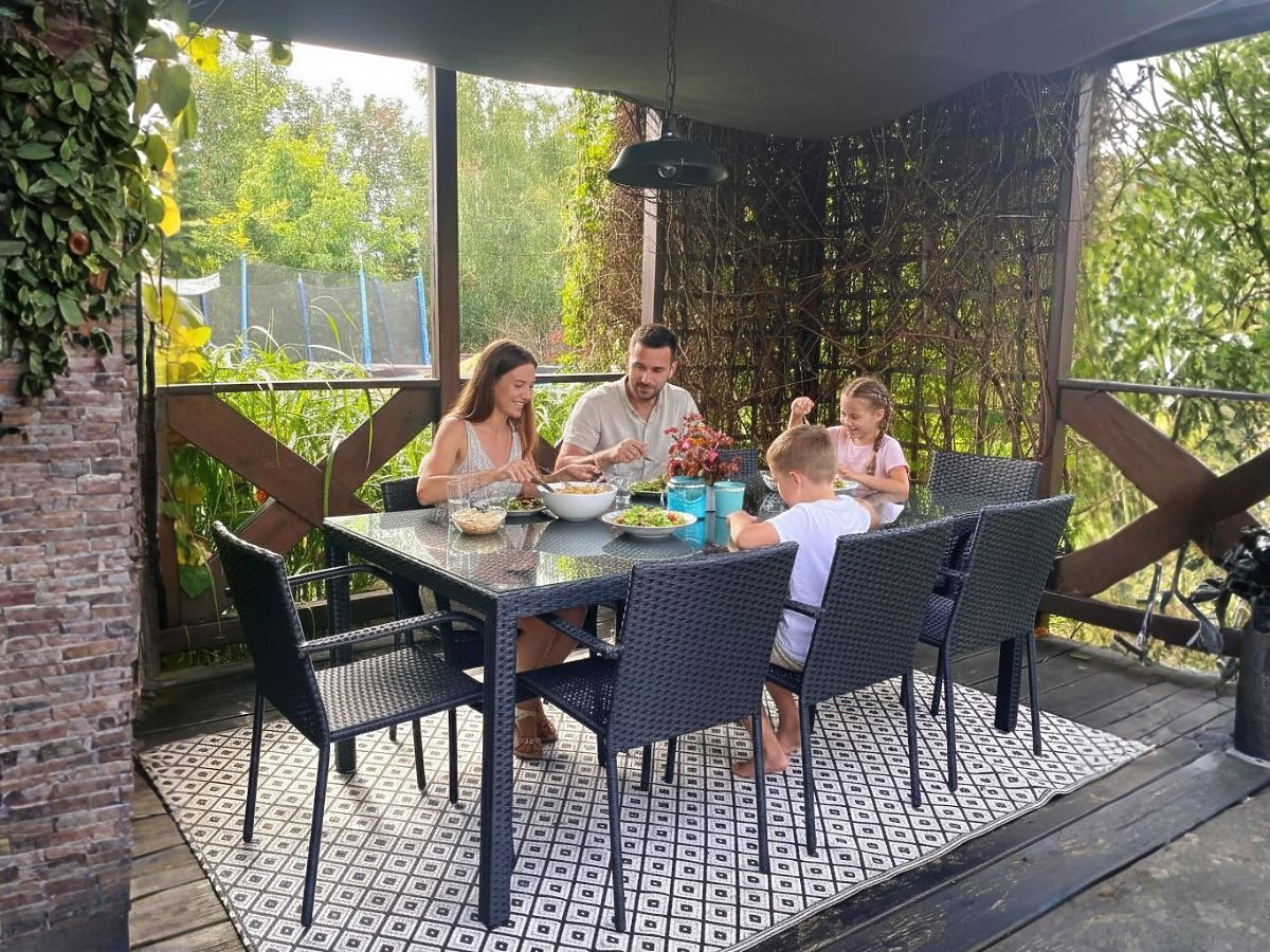 Die Gartenmöbel SOTTILE sind die ideale Lösung für diejenigen, die Eleganz, Komfort und Langlebigkeit von Gartenmöbeln schätzen. Das Ess-Set für 8 Personen bietet hervorragende Bedingungen für Treffen mit Ihren Liebsten und verbindet außergewöhnlichen Komfort mit einzigartigem Design. Jedes Element des Garten-Sets ist aus hochwertigem Technorattan gefertigt, was nicht nur seine Langlebigkeit und Wetterbeständigkeit gewährleistet, sondern auch eine einfache Pflege ermöglicht. Die hervorragende Verarbeitungspräzision unterstreicht den luxuriösen Charakter der Möbel, wodurch die Technorattan-Möbel SOTTILE zu einer wunderschönen Dekoration für jeden Außenbereich werden. Der Tisch mit den Stühlen ist regen- und UV-beständig, was garantiert, dass sie ihr ästhetisches Aussehen über viele Jahre hinweg behalten und zu einem unverzichtbaren Element jeder Garten-, Terrassen- oder Patioausstattung werden. Farbe des SOTTILE-Sets: schwarz – einheitliche, leicht gestreifte Struktur. Geflecht: Technorattan 7-8mm x 1,2mm. Möbelkonstruktion: Tisch – Aluminium, Stühle – Stahl. Das Set besteht aus 9 Elementen: 1 x Tisch: Länge: 200 cm, Breite: 100 cm, Höhe: 74 cm, Glasplatte aus 5 mm Sicherheitsglas, auf Technorattan-Geflecht gelegt. 8 x Stühle: Breite: 56 cm, Tiefe: 50 cm, Höhe: 84 cm, Sitzhöhe vom Boden: 44 cm, Rückenlehnenhöhe vom Sitz: 43 cm, Sitzbreite: 40 cm, Sitztiefe: 43 cm. Das Set wird auf 1 Palette mit den Maßen 120x80x210 cm, Gewicht 80 kg, versendet. Die Stühle sind nach dem Auspacken sofort einsatzbereit. Die Stühle sind stapelbar (können ineinander gesteckt werden), was die Lagerung erleichtert und wenig Platz beansprucht. Der Tisch ist zur einfachen, eigenständigen Montage gemäß der beiliegenden Anleitung vorgesehen. Die Glasplatte des Tisches ist auf Silikonsaugnäpfen befestigt, die sie vor dem Verrutschen schützen. Möglichkeit, Kissen für die Stühle hier zu kaufen. Technorattan ist wetterbeständig, jedoch empfehlen wir für eine noch längere Erhaltung des unveränderten Aussehens der Möbel den Kauf einer Schutzhülle. Die Abdeckung in dunkelgrauer Farbe ist einteilig und hat unten eine Kordel. Alle Abdeckungen sind maßgeschneidert und die Lieferzeit beträgt ca. 14 Werktage. Stellen Sie sich Gartenmöbel vor, die Ihre Erwartungen in jeder Hinsicht übertreffen – von der Beständigkeit bis zum Design. Das ist BELLO GIARDINO, wo jedes Detail zählt und Luxus auf Funktionalität trifft: Zeitlose Qualität: Unser synthetisches Rattan garantiert, dass die Möbel jahrelang halten, ohne an Schönheit oder Haltbarkeit zu verlieren. Wetterbeständigkeit: Unsere Möbel trotzen den härtesten Wetterbedingungen, von brennender Sonne bis zu eisigen Wintern, und bleiben dabei immer schön. Luxuriöser Komfort: Dicke, weiche Kissen laden zum Entspannen ein und bieten einen Komfort, der schwer anderswo zu finden ist. Leichtigkeit und Stärke: Die Aluminiumkonstruktion vereint das Beste aus beiden Welten – sie ist leicht, aber äußerst stabil. Design, das fasziniert: Jedes Element unserer Möbel wurde mit Blick auf Ästhetik und Funktionalität entworfen, um in jede Umgebung zu passen. Ob Sie Minimalismus lieben oder reiche, elegante Arrangements schätzen, unsere Möbel erfüllen Ihre Erwartungen und überschreiten die Grenzen gewöhnlicher Funktionalität und Ästhetik. Wir versichern, dass selbst die anspruchsvollsten Kunden dem Komfort und Stil, den BELLO GIARDINO bietet, nicht widerstehen können. Machen Sie Ihren Garten, Ihre Terrasse oder Ihren Balkon zu einer Oase der Entspannung und Eleganz, die Sie schon immer haben wollten. Warten Sie nicht, entdecken Sie BELLO GIARDINO noch heute und verwandeln Sie Ihre Außenbereiche in Orte, von denen Sie immer geträumt haben. Fotos von Möbeln von unseren Kunden:
