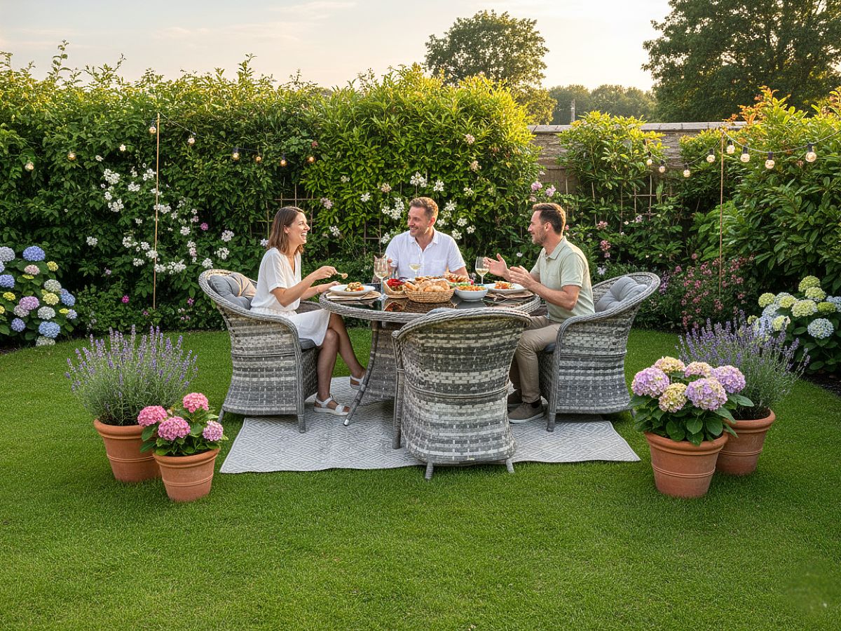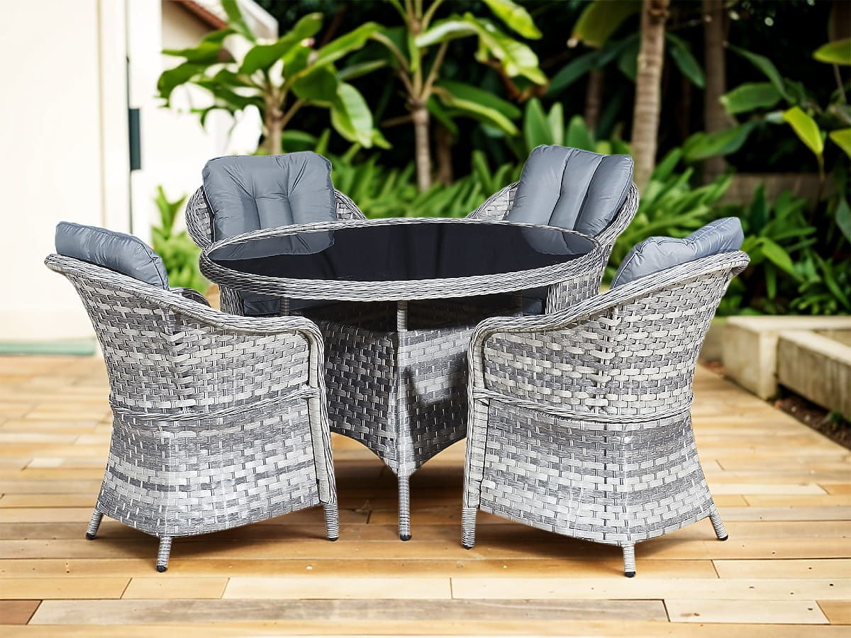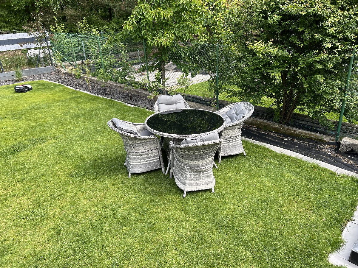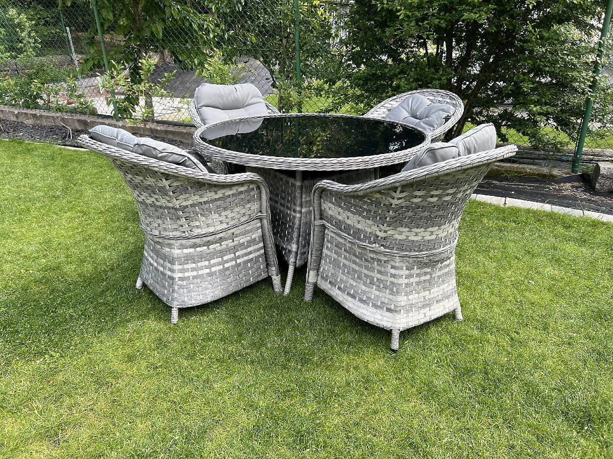 Das Tischmöbel-Set MODERNO ist ein Synonym für Modernität und Eleganz in der Raumgestaltung. Es zeichnet sich durch ein außergewöhnliches Design aus, das zu den modernsten Designtrends passt und gleichzeitig außergewöhnliche Haltbarkeit und Widerstandsfähigkeit durch die Verwendung von hochwertigem synthetischem Rattan bietet. Die Sessel und der Tisch aus dieser Kollektion sind absolut wetterbeständig, was das MODERNO-Set zu einer hervorragenden Wahl sowohl für den Innen- als auch für den Außenbereich macht. Dieses außergewöhnliche Möbelset wurde mit Blick auf die anspruchsvollsten Kunden entworfen, die eine Kombination aus Funktionalität, Haltbarkeit und modernem Design suchen. Farbe des Sets: hellgrau meliert, ungleichmäßig Farbe der Kissen: dunkelgrau Geflecht: flacher Technorattan 17mm x 1,2mm und runder Technorattan, glatte Struktur Konstruktion: Stahl Das Set besteht aus 5 Elementen: 4 x Sessel: Breite: 56 cm Tiefe: 70 cm Höhe: 81 cm 1 x Tisch (mit schwarzer Glasplatte aus 5mm Sicherheitsglas): Durchmesser: 120 cm Höhe: 74 cm Weitere Maße: Sitzhöhe des Sessels: 38 cm + 5 cm Kissen Höhe der Rückenlehne vom Sitz: 50 cm Breite der Armlehnen und Rückenlehne: 5 cm Sitzbreite und -tiefe: 52 x 52 cm Das Set wird auf 1 Palette mit den Maßen 120x100x210 cm, Gewicht 70 kg, geliefert. Dunkelgraue Kissen für die Sitze im Set enthalten (4 Stück) Alle haben abnehmbare Bezüge mit Reißverschluss, hergestellt aus Outdoor-Material (100% Polyester), die bei niedrigen Temperaturen gewaschen werden können. Die Kissenbezüge sind aus hochwertigem Stoff mit Teflonbeschichtung genäht, die sie vor Feuchtigkeit schützt. Die Kissenfüllung besteht aus hochwertigem Polsterschaum (mittlere Härte - T25), der Verformungen verhindert. Dicke der Kissen: 5 cm. Möglichkeit, Kissen nach Maß für dieses Set zu nähen: https://www.bg-meble.pl/pl/p/Usluga-Krawiecka-Poduszki-Na-Zamowienie-/742 Möglichkeit, Kissenbezüge nach Maß für dieses Set zu nähen: https://www.bg-meble.pl/pl/p/Usluga-Krawiecka-Poszewki-Na-Zamowienie/743 Um das Aussehen der Möbel so lange wie möglich zu erhalten, empfehlen wir den Kauf einer Schutzhülle. Die Abdeckung in dunkelgrau ist einteilig und hat unten eine Kordelzug. Alle Abdeckungen werden nach Maß gefertigt und die Lieferzeit beträgt ca. 14 Werktage. Stellen Sie sich Gartenmöbel vor, die Ihre Erwartungen in jeder Hinsicht übertreffen – von der Haltbarkeit bis zum Design. Das ist BELLO GIARDINO, wo jedes Detail zählt und Luxus auf Funktionalität trifft: Unvergängliche Qualität: Unser synthetisches Rattan garantiert, dass die Möbel jahrelang halten, ohne an Schönheit oder Haltbarkeit zu verlieren. Wetterbeständigkeit: Unsere Möbel trotzen den härtesten Wetterbedingungen, vom sengenden Sonnenlicht bis zu eisigen Wintern, und bleiben dabei immer schön. Luxuriöser Komfort: Dicke, weiche Kissen laden zur Entspannung ein und bieten Komfort, den man anderswo schwer findet. Leichtigkeit und Stabilität: Die Aluminiumkonstruktion vereint das Beste aus beiden Welten – sie ist leicht, aber außergewöhnlich stabil. Design, das bezaubert: Jedes Element unserer Möbel wurde mit Blick auf Ästhetik und Funktionalität entworfen, um in jede Umgebung zu passen. Ob Sie Minimalismus lieben oder reichhaltige, elegante Arrangements schätzen, unsere Möbel erfüllen Ihre Erwartungen und überschreiten die Grenzen gewöhnlicher Funktionalität und Ästhetik. Wir garantieren, dass selbst die anspruchsvollsten Kunden dem Komfort und Stil, den BELLO GIARDINO bietet, nicht widerstehen können. Machen Sie Ihren Garten, Ihre Terrasse oder Ihren Balkon zu einer Oase der Entspannung und Eleganz, die Sie sich schon immer gewünscht haben. Warten Sie nicht, entdecken Sie BELLO GIARDINO noch heute und verwandeln Sie Ihre Außenbereiche in Orte, von denen Sie immer geträumt haben. Fotos von unseren Kunden