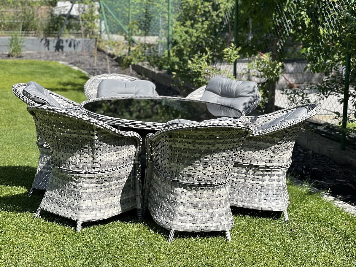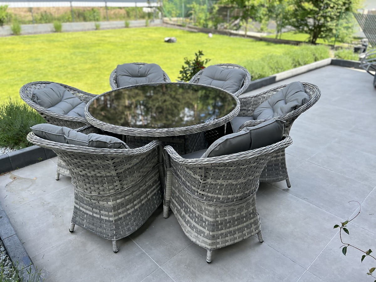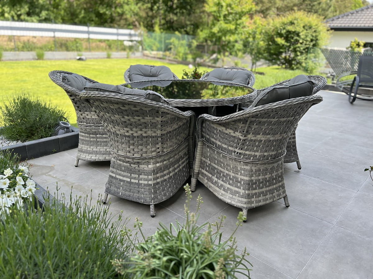 Das Essmöbel-Set MODERNO ist die Essenz modernen Designs und Innovation im Bereich von Outdoor- und Indoor-Möbeln. Es bietet eine einzigartige Verbindung von modernstem Design und Funktionalität und wird zum Herzstück jedes Raumes. Die Sessel und der Tisch dieser Kollektion sind aus hochwertigem synthetischem Rattan gefertigt, was absolute Wetterbeständigkeit gewährleistet und ihre Langlebigkeit und Haltbarkeit garantiert. Die Auswahl an Materialien höchster Qualität macht MODERNO GRANDE ideal für die anspruchsvollsten Kunden, die nicht nur Schönheit, sondern auch Praktikabilität und Widerstandsfähigkeit in ihren Essmöbeln suchen. Dieses Set ist die ideale Lösung für diejenigen, die Eleganz mit Modernität in ihrem Lebensraum verbinden möchten. Farbe des Sets: hellgrau meliert, uneinheitlich Farbe der Kissen: dunkelgrau Geflecht: flaches Technorattan 17mm x 1,2mm und rundes Technorattan, glatte Struktur Konstruktion: Stahl Das Set besteht aus 7 Elementen: 6 x Sessel: Breite: 56 cm Tiefe: 70 cm Höhe: 81 cm 1 x Tisch (mit schwarzer Glasplatte aus 5mm Sicherheitsglas): Durchmesser: 120 cm Höhe: 74 cm Weitere Maße: Sitzhöhe des Sessels: 38 cm + 5 cm Kissen Höhe der Rückenlehne vom Sitz: 50 cm Breite der Armlehnen und Rückenlehne: 5 cm Sitzbreite und -tiefe: 52 x 52 cm Das Set wird auf 1 Palette mit den Maßen 145x125x210 cm versendet, Gewicht 90 kg Kissen in dunkelgrauer Farbe für die Sitze im Setpreis enthalten (6 Stück) Alle haben abnehmbare Bezüge mit Reißverschluss, hergestellt aus Outdoor-Material (100% Polyester), die bei niedrigen Temperaturen gewaschen werden können. Die Kissenbezüge sind aus hochwertigem Stoff mit Teflonbeschichtung genäht, die sie vor Feuchtigkeit schützt. Die Kissenfüllung besteht aus hochwertigem Polsterschaum (mittlere Härte - T25), der Verformungen verhindert. Dicke der Kissen: 5 cm. Möglichkeit, Kissen auf individuelle Bestellung für dieses Set zu nähen: https://www.bg-meble.pl/pl/p/Usluga-Krawiecka-Poduszki-Na-Zamowienie-/742 Möglichkeit, Kissenbezüge auf individuelle Bestellung für dieses Set zu nähen: https://www.bg-meble.pl/pl/p/Usluga-Krawiecka-Poszewki-Na-Zamowienie/743 Für eine noch längere Erhaltung des unveränderten Aussehens der Möbel empfehlen wir den Kauf einer Schutzabdeckung. Die Abdeckung in dunkelgrauer Farbe ist einteilig und hat unten eine Kordel. Alle Abdeckungen werden auf Bestellung genäht und die Lieferzeit beträgt ca. 14 Werktage. Stellen Sie sich Gartenmöbel vor, die Ihre Erwartungen in jeder Hinsicht übertreffen – von der Widerstandsfähigkeit bis zum Design. Hier ist BELLO GIARDINO, wo jedes Detail zählt und Luxus auf Funktionalität trifft: Unveränderliche Qualität: Unser synthetisches Rattan garantiert, dass die Möbel jahrelang halten, ohne an Schönheit oder Haltbarkeit zu verlieren. Wetterbeständigkeit: Unsere Möbel trotzen den härtesten Wetterbedingungen, von sengender Sonne bis zu eisigen Wintern, und bleiben dabei immer schön. Luxuriöser Komfort: Dicke, weiche Kissen laden zur Entspannung ein und bieten Komfort, den man anderswo schwer findet. Leichtigkeit und Stabilität: Die Aluminiumkonstruktion verbindet das Beste aus beiden Welten – sie ist leicht, aber äußerst stabil. Design, das verzaubert: Jedes Element unserer Möbel wurde mit Blick auf Ästhetik und Funktionalität entworfen, um in jede Umgebung zu passen. Ob Sie Minimalismus lieben oder reiche, elegante Arrangements schätzen, unsere Möbel erfüllen Ihre Erwartungen und überschreiten die Grenzen gewöhnlicher Funktionalität und Ästhetik. Wir stellen sicher, dass selbst die widerstandsfähigsten Kunden dem Komfort und Stil, den BELLO GIARDINO bietet, nicht widerstehen können. Machen Sie Ihren Garten, Ihre Terrasse oder Ihren Balkon zu einer Oase der Entspannung und Eleganz, die Sie schon immer haben wollten. Warten Sie nicht, entdecken Sie BELLO GIARDINO noch heute und verwandeln Sie Ihre Außenbereiche in Orte, von denen Sie immer geträumt haben.